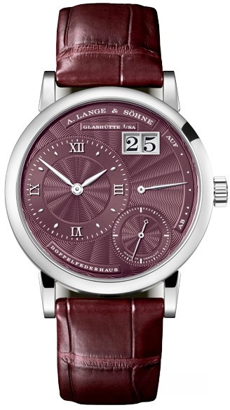 Часы A. Lange and Sohne Little Lange 1 комплектуются механизмом с ручным заводом L901.4. Запас хода 72 часа при полном заводе. Функции: указание времени – часы и минуты, маленькая секундная стрелка с функцией остановки при коррекции времени; указатель запаса хода; большой указатель даты Lange. Размеры корпуса 36.1 х 10 мм. Стекло и окно задней крышки корпуса сапфировое (твёрдость 9). Корпус из белого золота 18к. Циферблат бордовый гильошированный. Стрелки и накладные метки из белого золота. Ремешок из кожи аллигатора. Стандартная застёжка из белого золота 18к. Серия ограничена - 100 шт.