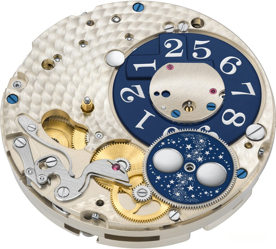 Часы A. Lange and Sohne Little Lange 1 Moon Phase комплектуются механизмом с ручным заводом L121.2. Запас хода 72 часа при полном заводе. Функции: указание времени – часы и минуты, маленькая секундная стрелка с функцией остановки при коррекции времени; указатель запаса хода; большой указатель даты Lange; указатель фазы Луны. Элементы управления: заводная головка для завода часов и установки времени; кнопка быстрой коррекции большого указателя даты; корректор указателя фазы Луны. Размеры корпуса 36.8 х 9.5 мм. Стекло и окно задней крышки корпуса сапфировое (твёрдость 9). Корпус из белого золота 18к. Циферблат синий авантюриновый. Ремешок из кожи аллигатора, стандартная застёжка из белого золота 18к.