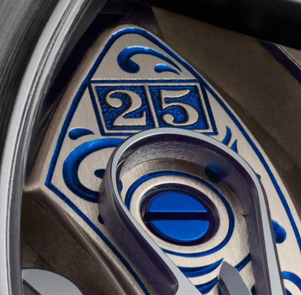 Часы A. Lange and Sohne Lange 1 Edition 25th Anniversary представлены в корпусе из белого золота 18к размером 38.5 х 10.7 мм и водонепроницаемостью 30 м. Внутри корпуса установлен механизм с ручным заводом, Калибр L121.1, обладающий запасом хода 72 часа. На серебристом циферблате отображаются часы, минуты, секунды, дата, запас хода. Часы комплектуются ремешком из кожи аллигатора с вставкой из белого золота 18к. Серия ограничена - 250 штук.