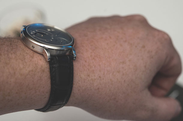 Часы A. Lange and Sohne Lange 1 Grand Lange 1 Moon Phase 139.025 выпущены в корпусе из 950 платины, размером 41 х 9,5 мм с водонепроницаемостью 30 м и увеличенной датой. Внутри корпуса установлен механизм с ручным заводом, Калибр L095.3. На серебристом циферблате отображаются часы, минуты, секунды, дата, запас хода, фаза луны. Запас хода 72 часа. Часы комплектуются ремешком из кожи аллигатора с платиновой вставкой.