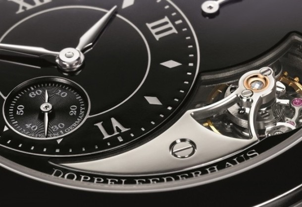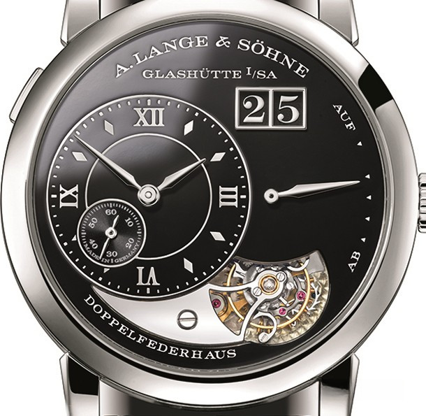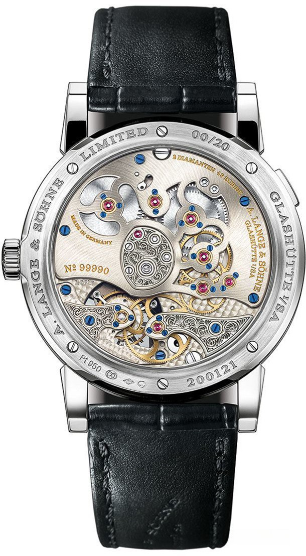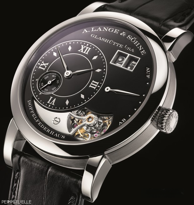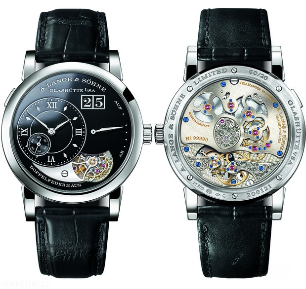 Круглый полированный корпус новинки изготовлен из платины, диаметром 38,5 мм, толщиной 10,2 мм. На торце рифленой заводной головки, расположенной на 3 часах, выгравировано наименование бренда A. Lange & Söhne. На 10 часах размещен пушер для быстрой коррекции даты. Сапфировое стекло установлено на передней стороне часового корпуса и на его завинчивающейся задней крышке. Циферблат, покрытый черной эмалью, с децентрализованным основным циферблатом с римскими цифрами и часовыми индексами, выполненными, как и стрелки, из родированного белого золота. Модель оснащена мануфактурным немецким механизмом с ручным заводом A. Lange & Söhne L961.3, собранным, отрегулированным (в пяти положениях), отменно отделанным и декорированным вручную, с трехчетвертной платиной, диаметром 30,6 мм, толщиной 5,9 мм, состоящим из 378 деталей, на 51 камне (в том числе 2 алмазных), с семью винтовыми золотыми шатонами, анкерным спуском, балансовой частотой 21600 полуколебаний в час (3 гц), с 72-часовым запасом хода, функциями индикации часов, минут (посредством соответствующих стрелок на децентрализованном основном циферблате), секунд (на малом боковом циферблате, расположенном на 8 часах), даты (посредством соответствующего цифрового указателя в крупной сдвоенной апертуре, расположенной на 13 часах), запаса хода (посредством соответствующего аналогового указателя, расположенного на 3 часах), а также с минутным турбийоном, каретка которого просматривается в апертуре, расположенной на 5 часах. Поставляется на черном ремешке из крокодиловой кожи с платиновой застежкой. Лимитированный выпуск 20 экземпляров.