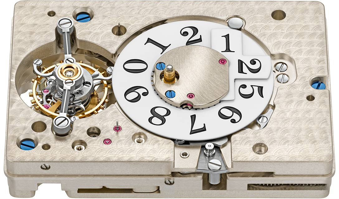 Часы A. Lange and Sohne Cabaret Tourbillon Handwerkskunst представлены в корпусе из платины 950 размером 29.5 х 39.2 х 10.3 мм водонепроницаемостью 30 метров. Внутри корпуса находится механизм с ручным заводом, Калибр L042.1, обладающий запасом хода 120 часов. На сером циферблате отображаются часы, минуты, секунды, дата, запас хода. Часы поставляются на ремешке из кожи аллигатора с вставкой из платины 950. Серия ограничена - 30 шт.