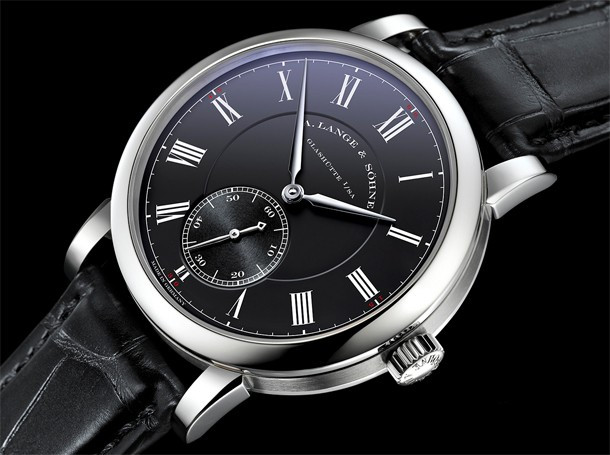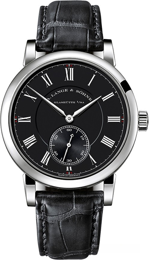 Часы A. Lange and Sohne Richard Lange Richard Lange “Pour le Merite” 260.028 выпущены в корпусе из белого золота 18к, размером 40,5 х 10.5 мм. Серия ограничена (218 штук). Внутри корпуса установлен механизм с ручным заводом, Калибр Lange 044.1. На черном циферблате отображаются часы, минуты, секунды. Запас хода 36 часов. Часы комплектуются ремешком из кожи аллигатора с вставкой из белого золота 18к.