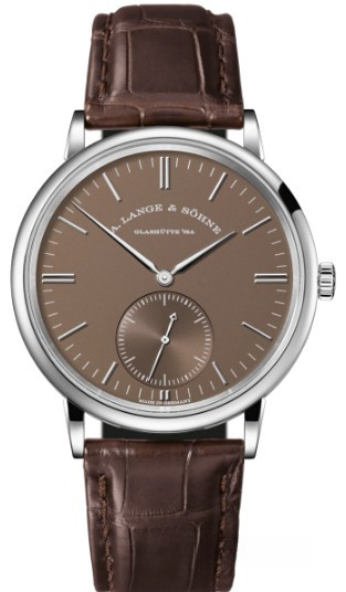 Часы A. Lange and Sohne Saxonia Saxonia Automatik 380.042 выпущены в корпусе из белого золота 18к, размером 38,5 х 7,8 мм с водонепроницаемостью 30м. Внутри корпуса установлен автоматический механизм, Калибр L086.1. На коричневом циферблате отображаются часы, минуты, секунды. Часы и минуты показаны при помощи центральных мечевидных стрелок, малая секундная стрелка расположена на 6-ти часах. Запас хода 72 часа. Часы комплектуются синим ремешком из кожи аллигатора с вставкой из белого золота 18к.