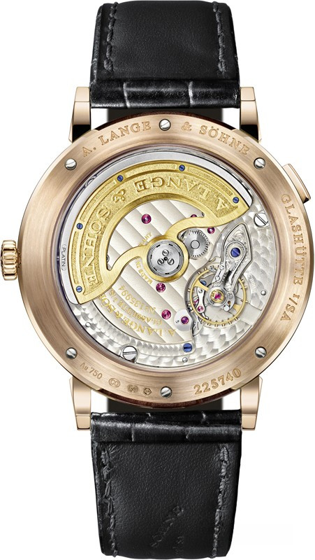 Часы комплектуются мануфактурным механизмом Калибр L086.5 с автоматическим заводом; механизм изготовлен в соответствии с самыми высокими стандартами качества Lange, вручную декорирован и собран; произведена настройка точности хода в пяти положениях; платины и мосты изготовлены из нейзильбера без использования покрытий; балансовый мост гравирован вручную. Ударостойкий баланс с регулировочными винтами; изготовленная в мастерских Lange спираль, частота 21600 полуколебаний в час, прецизионная система настройки положения равновесия баланса с боковым винтом и пружиной формы “лебединая шея”. Запас хода 72 часа при полном заводе. Функции: указание времени – часы и минуты, маленькая секундная стрелка с функцией остановки при коррекции времени; большой указатель даты, указатель фазы Луны. Заводная головка для завода часов и установки времени, кнопка быстрой коррекции большого указателя даты, корректор указателя фазы Луны. Размеры корпуса: диаметр 40 мм; толщина 9,8 мм. Стекло и окно задней крышки корпуса из сапфира. Корпус изготовлен из розового золота 18к. Циферблат черного цвета. Вручную прошитый ремешок из кожи аллигатора. Стандартная застёжка из розового золота 18к.