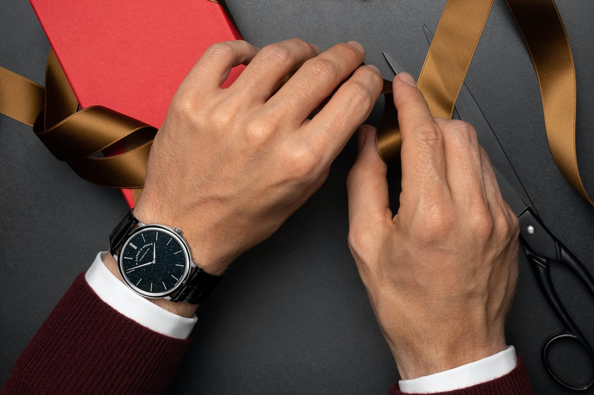 Часы A. Lange and Sohne Saxonia Saxonia Ultra Thin выпущены в корпусе из белого золота 18к, размером 40 х 6.2 мм с водонепроницаемостью 30м. Внутри корпуса установлен механизм с ручным заводом, Калибр L093.1. На черном циферблате отображаются часы, минуты. Запас хода 72 часа. Часы комплектуются ремешком из кожи аллигатора с вставкой из белого золота 18к. Серия ограничена - 50 штук.