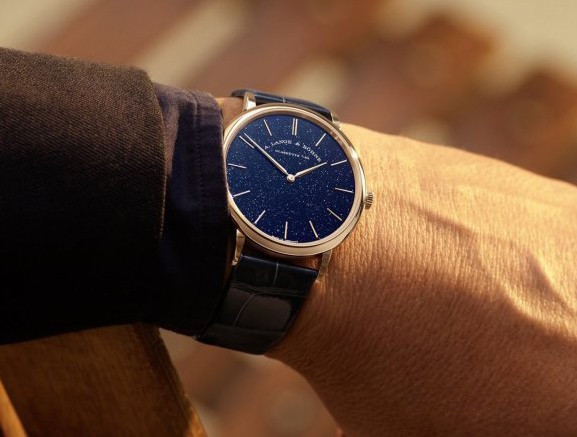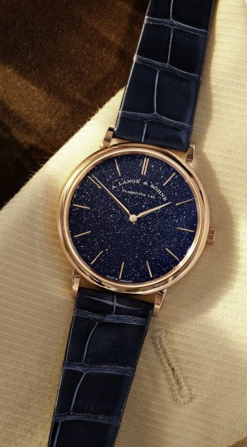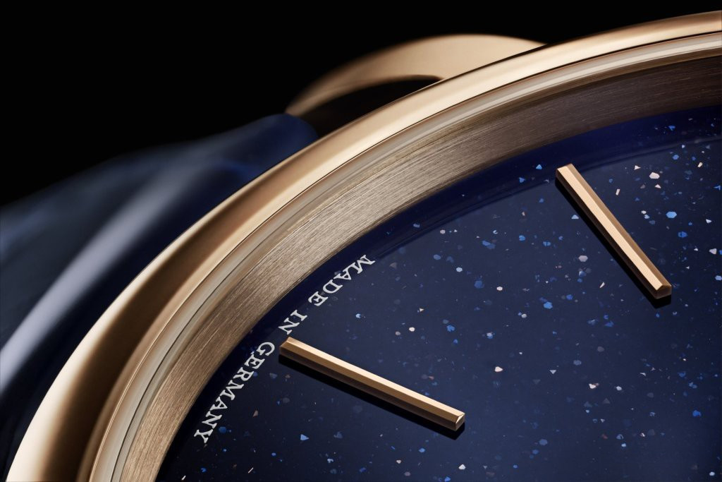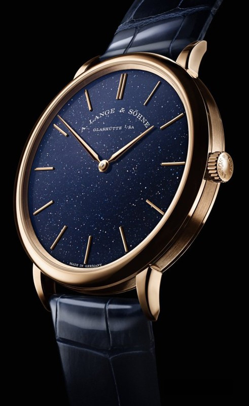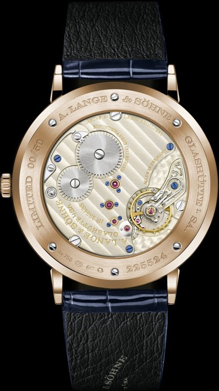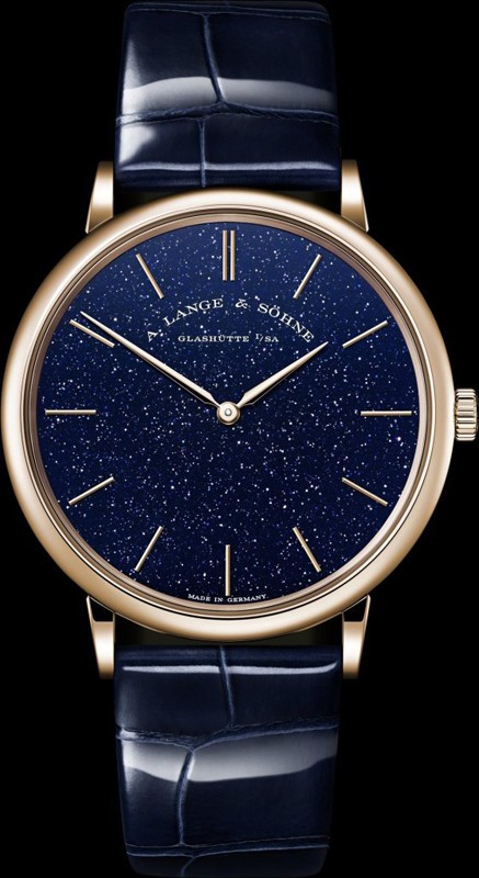 Часы A. Lange and Sohne Saxonia Saxonia Ultra Thin выпущены в корпусе из розового золота 18к, размером 40 х 6.2 мм с водонепроницаемостью 30м. Внутри корпуса установлен механизм с ручным заводом, Калибр L093.1. На синем циферблате отображаются часы, минуты. Запас хода 72 часа. Часы комплектуются ремешком из кожи аллигатора с вставкой из розового золота 18к. Серия ограничена - 50 штук.