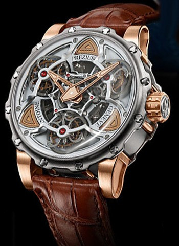 Для Антуана Прецьюзо и его сына Флориана число три стало вдохновением для создания новой модели; модели Antoine Preziuso Tourbillon des Tourbillons. Антуан работает в часовом деле уже третье десятилетие; Флориан часовщик третьего поколения и ему исполнилось 33 в этом году. Число три также ознаменовало количество турбийонов в новых часах. Три турбийона размещены на виду, на передней панели механизма. Как бы ни завораживал механизм одного турбийона, наличие трех турбийонов только усиливает визуальное воздействие. Турбийоны работают с частотой 21600 пк/ч и находятся в идеальной синхронизации друг с другом. Вихреобразное движение всех трех турбийонов объединено в каретку, которая заполняет весь корпус. Каретка сбалансирована для идеальной инерции, так как каждые десять минут происходит полное ее вращение. Задняя крышка механизма выполнена из сапфирового стекла. Корпус диаметром 45 мм и высотой 14 мм выполнен из комбинации стали, 18-каратного золота и титана 5 класса. Усложненный механизм показывает только часы и минуты. В центре установлены стрелки, выполненные из того же золота, что и дужки, колонны и заводная головка. Они частично обработаны и гравированы. Модель Antoine Preziuso Tourbillon des Tourbillons оснащена ремешком из кожи аллигатора.