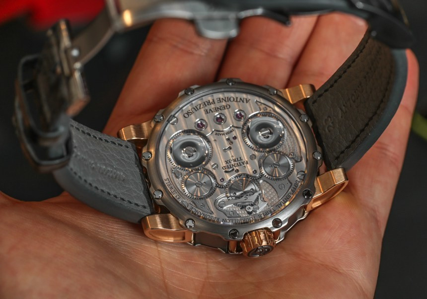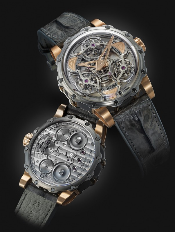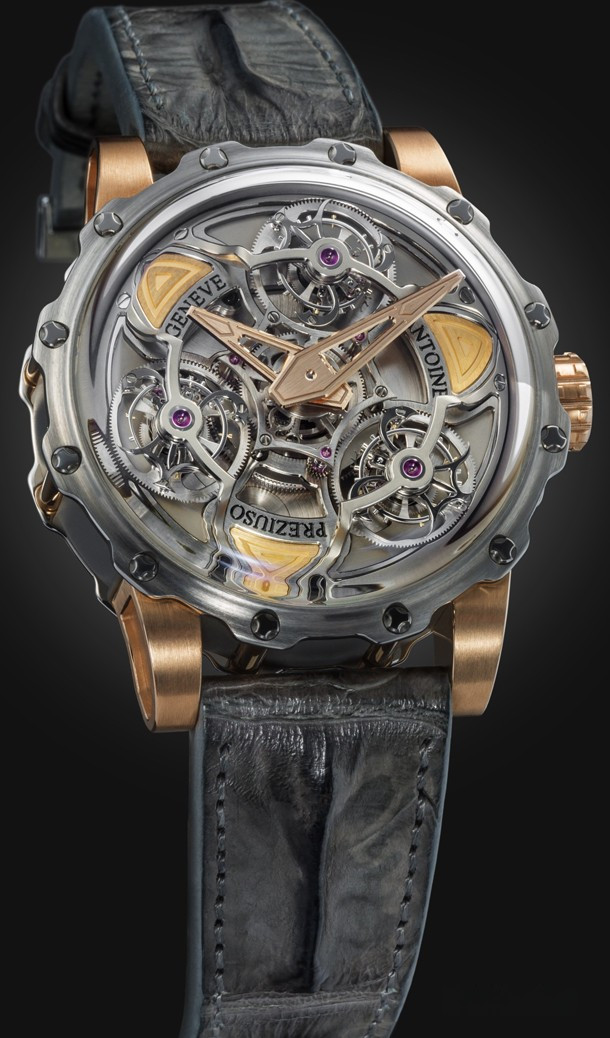 Для Антуана Прецьюзо и его сына Флориана число три стало вдохновением для создания новой модели; модели Antoine Preziuso Tourbillon des Tourbillons. Антуан работает в часовом деле уже третье десятилетие; Флориан часовщик третьего поколения и ему исполнилось 33 в этом году. Число три также ознаменовало количество турбийонов в новых часах. Три турбийона размещены на виду, на передней панели механизма. Как бы ни завораживал механизм одного турбийона, наличие трех турбийонов только усиливает визуальное воздействие. Турбийоны работают с частотой 21600 пк/ч и находятся в идеальной синхронизации друг с другом. Вихреобразное движение всех трех турбийонов объединено в каретку, которая заполняет весь корпус. Каретка сбалансирована для идеальной инерции, так как каждые десять минут происходит полное ее вращение. Задняя крышка механизма выполнена из сапфирового стекла. Корпус диаметром 45 мм и высотой 14 мм выполнен из комбинации стали, 18-каратного золота и титана 5 класса. Усложненный механизм показывает только часы и минуты. В центре установлены стрелки, выполненные из того же золота, что и дужки, колонны и заводная головка. Они частично обработаны и гравированы. Модель Antoine Preziuso Tourbillon des Tourbillons оснащена ремешком из кожи аллигатора.