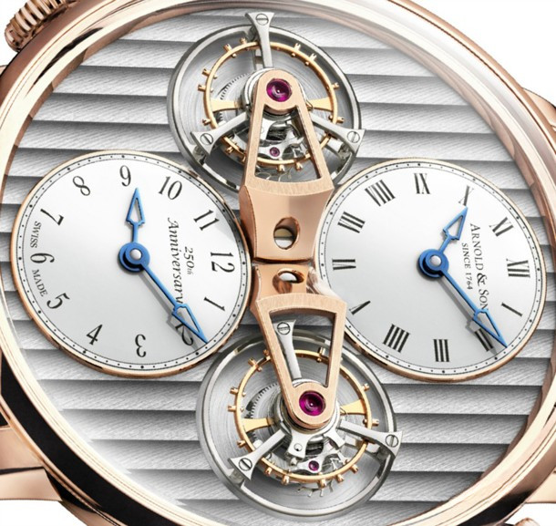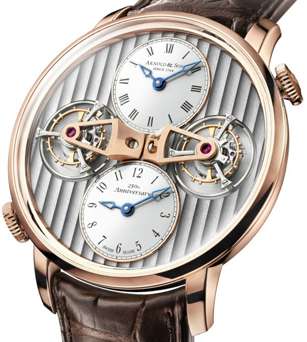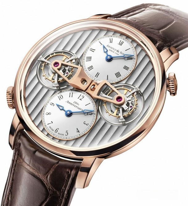 Часы Double Tourbillon Escapement Dual Time (Ref. 1DTAR.L01A.C120A) от британской часовой компании Arnold & Son обладают круглым полированным корпусом, изготовленным из 18-каратного розового золота, диаметром 43,5 мм, водонепроницаемый до 30 метров. Циферблат серого цвета, отделанный вертикальными "женевскими волнами" ("Cotes de Geneve") с двумя малыми боковыми лакированными циферблатами белого цвета, расположенными на 12 и 6 часах, причем один из них с арабскими, а второй с римскими цифрами. Стрелки на обоих - вороненые, скелетированные. Каретки турбийонов расположены на 3 и 9 часах. Модель оснащена мануфактурным швейцарским механизмом с ручным заводом Arnold & Son A&S8513, на 42 камнях, с двумя заводными барабанами, 90-часовым запасом хода, функциями индикации местного времени и второго часового пояса. Поставляется на коричневом ремешке из кожи аллигатора с застежкой из 18-каратного розового золота. Лимитированный выпуск 28 экземпляров.