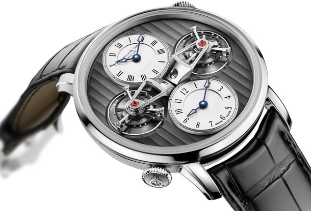 Часы Double Tourbillon Escapement Dual Time от британской часовой компании Arnold & Son обладают круглым полированным корпусом, изготовленным из 18-каратного белого золота, диаметром 43,5 мм, водонепроницаемый до 30 метров. Циферблат серого цвета, отделанный вертикальными "женевскими волнами" ("Cotes de Geneve") с двумя малыми боковыми лакированными циферблатами белого цвета, расположенными на 12 и 6 часах, причем один из них с арабскими, а второй с римскими цифрами. Стрелки на обоих - вороненые, скелетированные. Каретки турбийонов расположены на 3 и 9 часах. Модель оснащена мануфактурным швейцарским механизмом с ручным заводом Arnold & Son A&S8513, на 42 камнях, с двумя заводными барабанами, 90-часовым запасом хода, функциями индикации местного времени и второго часового пояса. Поставляется на черном ремешке из кожи аллигатора с застежкой из 18-каратного белого золота. Лимитированный выпуск 28 экземпляров.