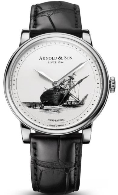 Часы комплектуются эксклюзивным механизмом A&S1001 с ручным заводом от Arnold & Son, с 21 камнем, имеет диаметр 30 мм, толщину 2.7 мм; запас хода – более 90 часов, 21 600 пк/час. На серебристом циферблате отображаются часы и минуты. На циферблате нарисованная вручную миниатюра на серебристо-белом и серебристо-опаловом фоне. Корпус изготовлен из белого золота 18к диаметром 40 мм и водонепроницаемостью до 30 метров. Выпуклое сапфировое стекло с антибликовым покрытием на обеих сторонах, задняя часть корпуса проглядывается сквозь сапфировое стекло. Ремешок: черная кожа аллигатора; прошитый вручную.