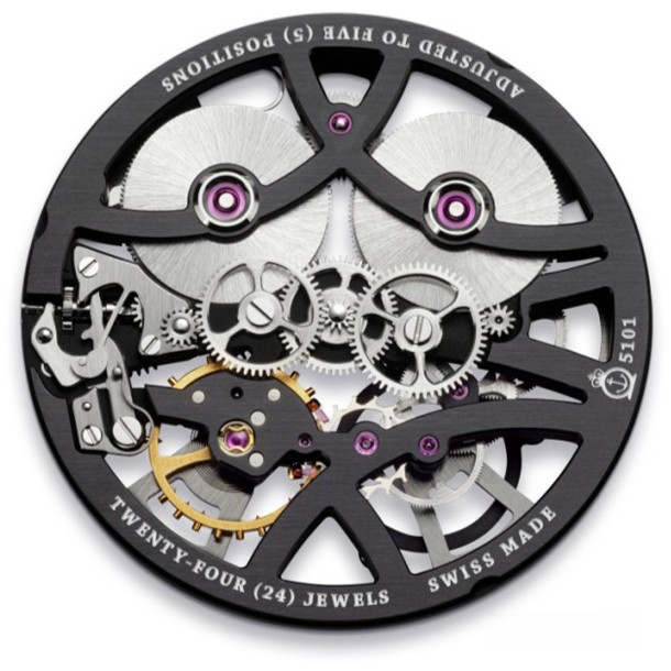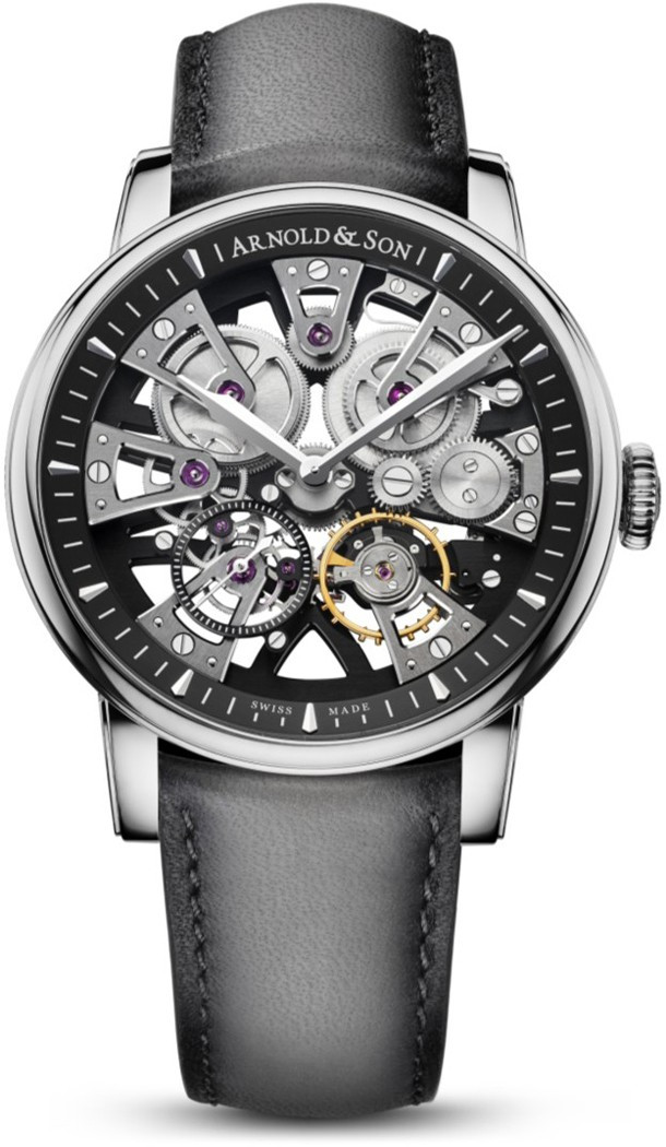 Новинка представлена в корпусе из нержавеющей стали диаметром 41.5 мм, водонепроницаемость 30 метров. Обе стороны корпуса покрыты сапфировым стеклом с антибликовым покрытием. Механизм A&S5101, полностью скелетированный и симметричный, с ручным заводом, 24 камня, запас хода 90 часов. Функции: часы, минуты, секунды. Циферблат серый. Ремешок из кожи теленка с застежкой из нержавеющей стали.