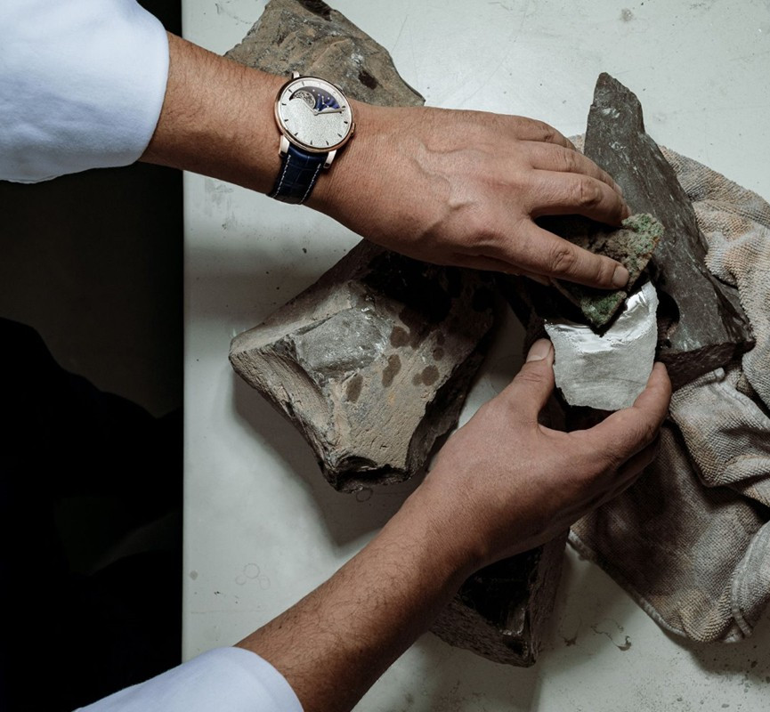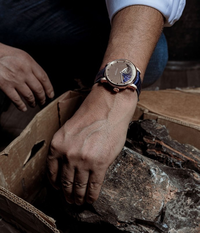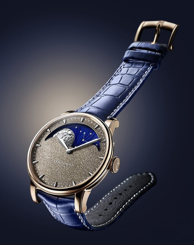 Часы Arnold & Son Perpetual Moon Obsidian представлены в корпусе из розового золота 18к размером 42 х 11.43 мм водонепроницаемостью 30 метров. Внутри корпуса установлен механизм с ручным заводом, Калибр A&S1512, обладающий запасом хода 90 дней. На золотистом с синим циферблате отображаются часы, минуты, фаза луны. Часы поставляются на ремешке из кожи аллигатора с вставкой из розового золота 18к. Серия ограничена - 28 шт.