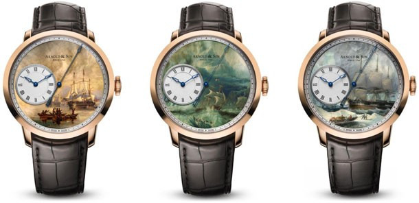 Arnold & Son представляет новую лимитированную коллекцию из трех моделей John Franklin Set, выполненных под вдохновением от трех знаменитых полотен из Национального морского музея в Лондоне. Сет из трех моделей описывает различные эпизоды из истории путешествий HMS Erebus и HMS Terror – кораблей, которые в конечном итоге погибли в ходе неудачной экспедиции сэра Джона Франклина по освоению Арктики в середине XIX века. На перламутровом циферблате каждой модели John Franklin Set мастер по миниатюрной живописи изобразил репродукции масляных полотен из коллекции Национального морского музея в Лондоне. Модель под названием «Дружеская встреча» (Friendly Encounter) изображает корабли HMS Erebus и HMS Terror в Новой Зеландии в 1840 году, где экипаж вел мирные переговоры с коренным населением маори. Собираясь в свое последнее путешествие в воды близ северной Канады, сэр Джон Франкин взял с собой морской хронометр, сделанный Джоном Роджером Арнольдом в 1815 году с 8-дневным запасом хода. Именно этот хронометр сохранился после смерти владельца, был обнаружен спасательной экспедицией и впоследствии перекуплен членами Национального морского музея. Модели коллекции Sir John Franklin Set оснащены мануфактурным автоматическим калибром A&S6103 с функцией «мертвой» секунды True Beat, поэтому секундная стрелка этих часов движется не плавно, а скачком раз в секунду с частотой 1 Гц. Часы выпускаются в 44-миллиметровой корпусе из 18-каратного розового золота на коричневом ремешке из кожи аллигатора. Серия ограничена – выпущено 28 наборов по три модели.