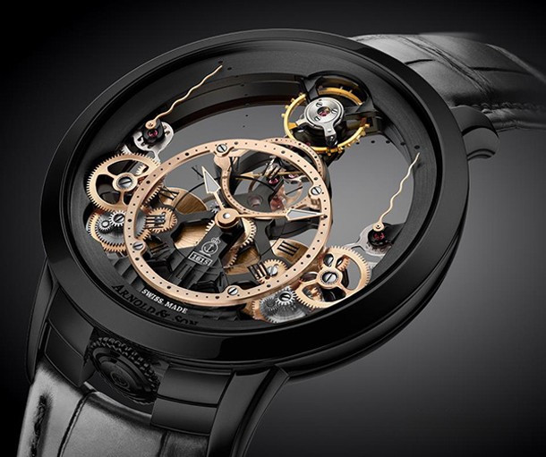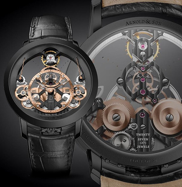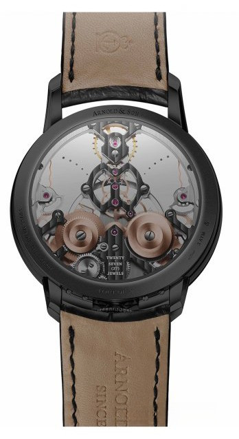 Arnold & Son представляет новую модель своих культовых часов Time Pyramid с округленным Калибром A&S1615, вмонитрованным в корпус из нержавеющей стали с черным покрытием PVD с новой задней крышкой корпуса, великолепно украшеной рисунком гильоше с обеих сторон. Скелетонизированный Калибр A&S1615 соответствует первоначальным установкам бренда относительно расположения компонентов и детального визуального 3D эффекта. Части механизма и индикаторы часов выстроены на трех уровнях: вспомогательный секундный циферблат расположен на самом нижнем уровне, часовой индикатор на сапфировом циферблате расположен на среднем уровне, а золотое кольцо для индикации минут расположено на самом верхнем уровне. Поскольку механизм очень тонкий – всего лишь 4,4 мм - множественные уровни придают удивительную глубину и детализацию часам. Зубчатая передача расположена вертикально в линейном формате, соединяя два барабана на отметке шесть часов с колесом баланса на отметке 12:00, и наделяя механизм пирамидальной структурой. Мосты сконструированы таким образом, что все колеса, два пружинных барабана, анкерный механизм и колесо баланса великолепно видны через циферблат. Два пружинных барабана снабжают Калибр с ручным заводом удивительным 90-часовым запасом хода, и обеспечивают более равномерное действие на колеса. Каждая модель часов Time Pyramid составляет 44,6 мм в диаметре. Часы оснащены ремешком из кожи аллигатора ручной работы. Серия ограничена 50 шт.