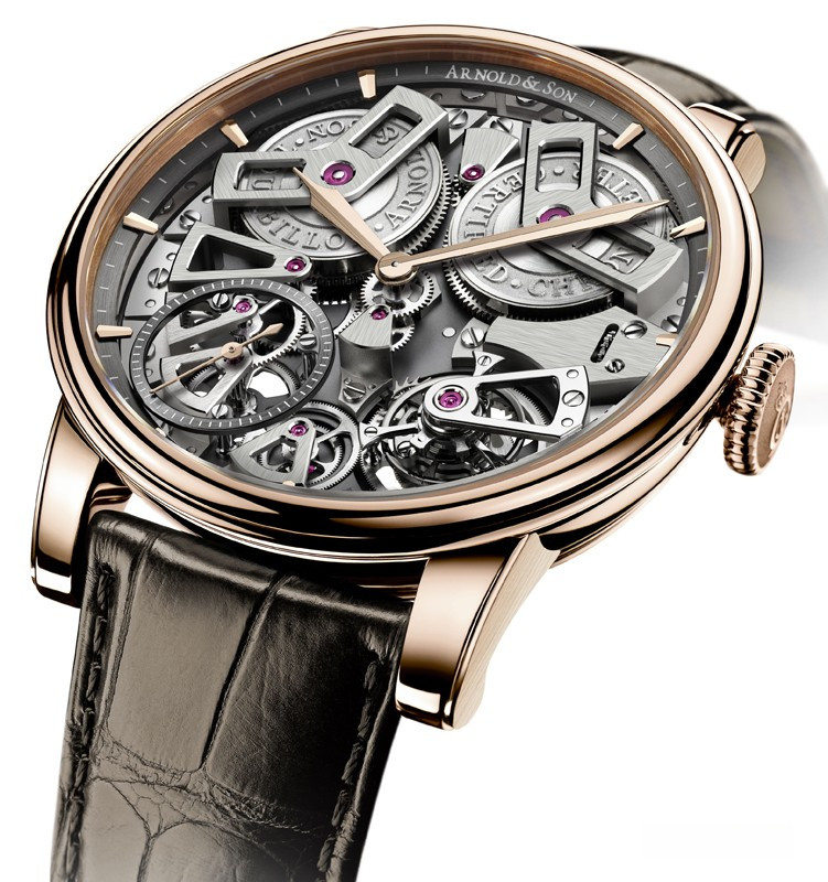 Часы Arnold & Som Tourbillon Chronometer No 36 представлены в корпусе из розового золота 18к диаметром 46 мм и водонепроницаемостью 30 метров. Внутри корпуса установлен механизм хронометра с ручным заводом, Калибр A&S8600 с запасом хода 90 часов и функцией турбийона. На сером скелетированном циферблате отображаются часы, минуты, секунды, клеть турбийона расположена между 4-мя и 5-ю часами. Модель поставляется на ремешке из кожи аллигатора с вставкой из розового золота 18к.