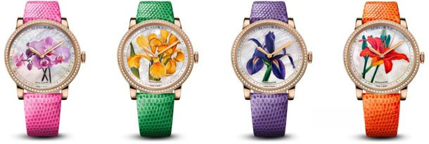 Arnold & Son объединили изысканный цветочный стиль ручной росписи с великолепным искусством часового производства. Специальная серия HM Flower от Arnold & Son создана для женщин, которые ценят качество высококлассного часового искусства с красивым дизайном. Каждая из четырех моделей серии отображает миниатюру в виде распустившегося цветка – ручную роспись, богатую глубокой гаммой цветов, подчеркивающей изысканный циферблат из белого перламутра. Эксклюзивный характер этих четырех замечательных часов заметен и в ограниченной серии в восемь единиц для каждой модели. Внутри корпуса находится мануфактурный часовой механизм A&S1001 с отделкой Haute Horlogerie. Он имеет два барабана, которые обеспечивают 90 часов запаса хода и гарантируют постоянную работу и, в свою очередь, стабильный хронометраж и больше точности. Все палеты и мосты в часовом механизме имеют вручную снятую фаску и также украшены: свидетельство векового традиционного мастерства Arnold & Son. Тираж моделей HM Flower Edition лимитирован до 8 единиц каждой версии. Безель инкрустирован бриллиантами.