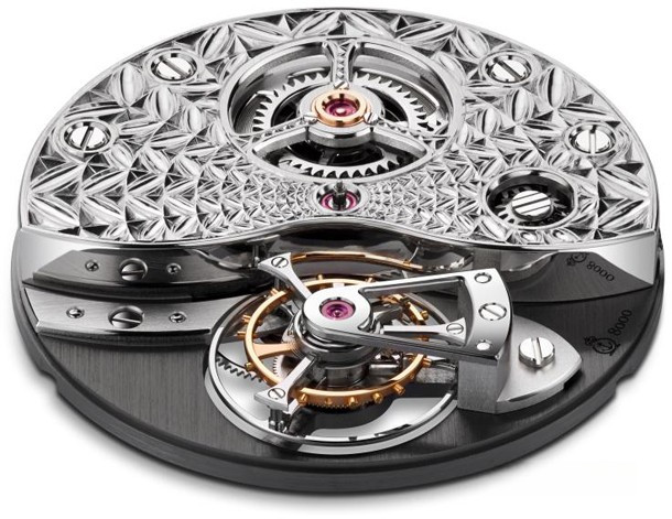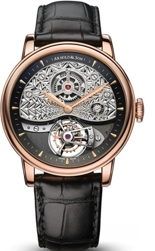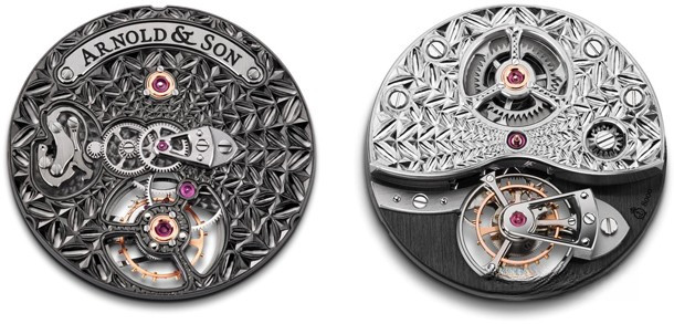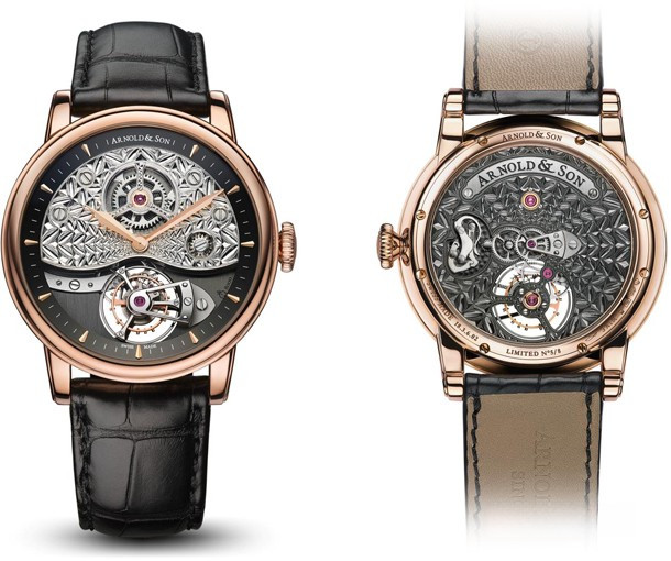 Часы TE8 Métiers d'Art II от британской часовой компании Arnold & Son имеют круглый полированный корпус, изготовленный из 18-каратного розового золота, диаметром 44,0 мм, водонепроницаемый до 30 метров. Рифленая заводная головка расположена на 3 часах. Сапфировое стекло установлено на передней стороне часового корпуса и на его завинчивающейся задней крышке. Цифкрблат как таковой отсутствует, на черном фланце нанесена минутная разметка и расположены накладные золотые часовые индексы. Стрелки также золотые, мечевидной формы. Модель оснащена мануфактурным швейцарским механизмом с ручным заводом Arnold & Son A&S8000, на 19 камнях, с балансовой частотой 21600 полуколебаний в час (3 гц), 80-часовым запасом хода, функциями индикации часов и минут (посредством соответствующих центральных стрелок). Калибр сконструирован таким образом, что турбийон и балансовое колесо просматривались на 6 и 12 часах соответственно. Отделка и декорирование выполнены в полном соответствии с требованиями Haute Horlogerie. В частности, платы изготовлены из немецкого серебраи полностью вручную гравированы; детали механизма родированы, мосты со скошенными и полированными краями, отделанные циркулярным зернением; резьбовые шатоны золотые, винты со скошенными и зеркально полированными головками. Поставляется на черном или коричневом ремешке из кожи аллигатора застежкой из 18-каратного розового золота. Лимитированный выпуск 8 эеземпляров.