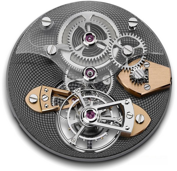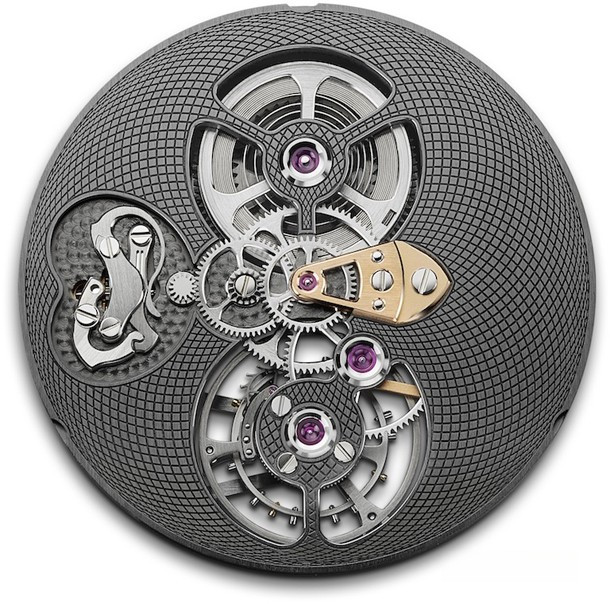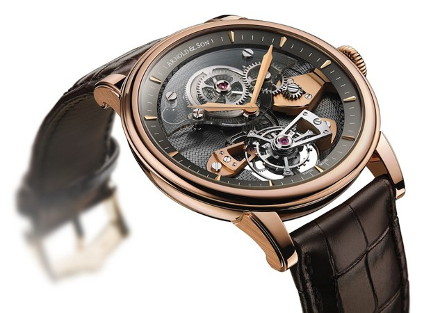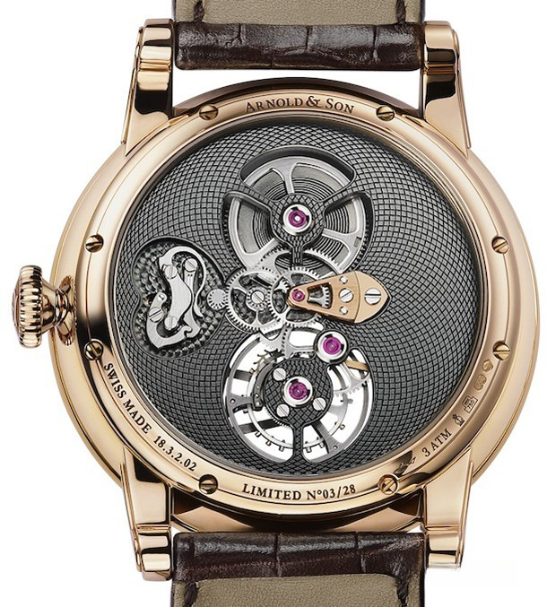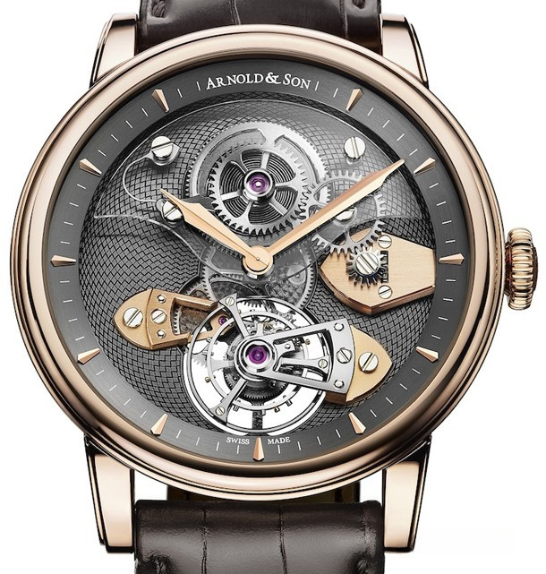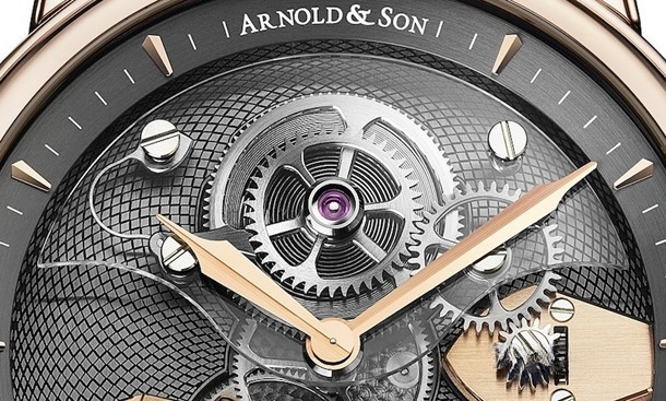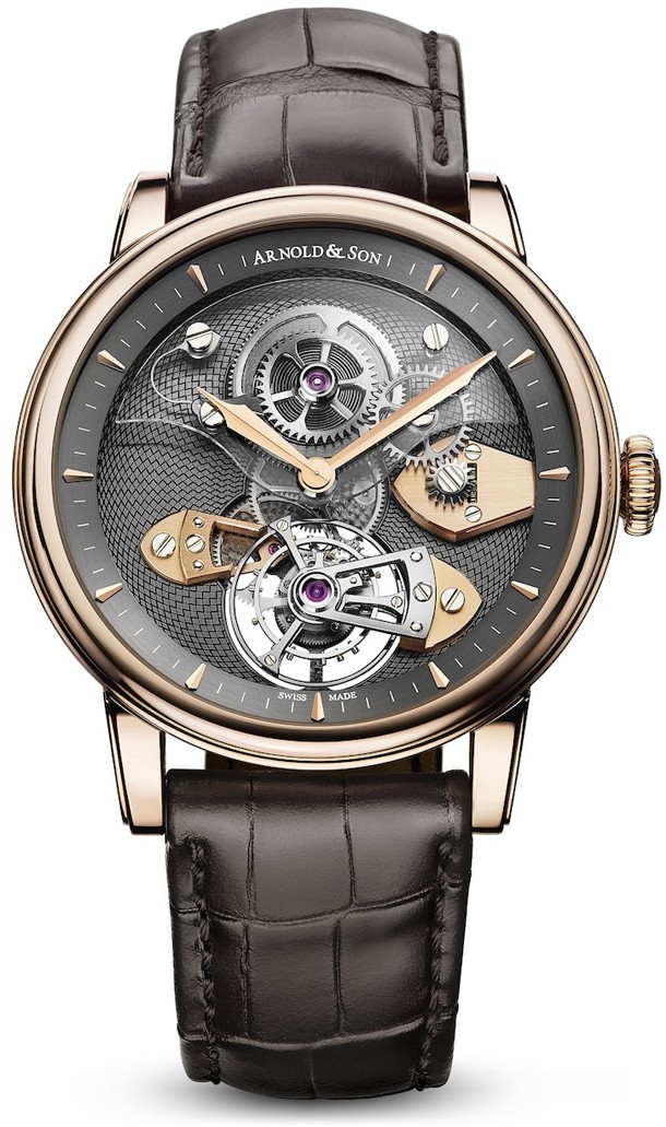 Часы Arnold & Son Royal TES Tourbillon обладают 1-минутным турбийоном, работающим с частотой 3 Гц или 21 600 колебаний в час. весь механизм выглядит так, как будто бы мастер собрал его в обратном порядке, то есть, то, что во многом называется "внутренностями" часов и, как правило, находится с задней части корпуса, теперь расположено со стороны циферблата. И этот воистину потрясающий вид открывается владельцу каждый раз, когда он или она хотят взглянуть на часы. Часовой механизм A&S8100 собран с точностью до наоборот от стандартной схемы. И даже если это не первый раз, когда встречается понятие "вывернутости наизнанку", в котором Arnold & Son практически до неприличия демонстрируют совершенство в изготовлении часов, следующим шагом является помещение моста из сапфирового стекла значительных размеров над верхней половиной часового механизма. Говоря о сероватом оттенке часового механизма, нельзя не упомянуть об его изысканном контрасте с 44-миллиметровым в диаметре корпусом из красного золота, который, конечно же, оснащен сапфировым стеклом как с задней части, так и со стороны циферблата.