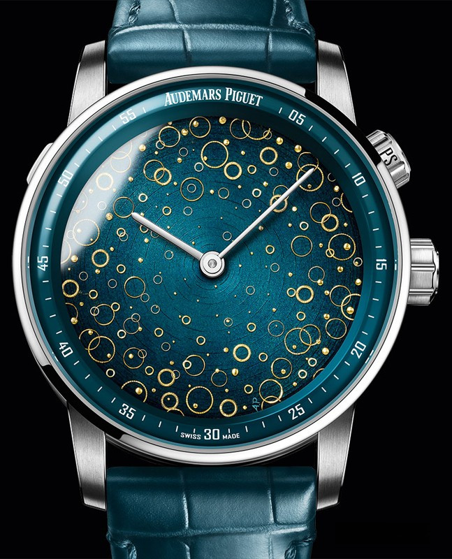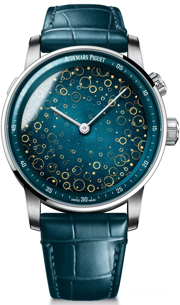 Часы Audemars Piguet Code 11.59 Grande Sonnerie Carillon Supersonnerie с репетиром представлены в корпусе из белого золота 18к размером 41 мм водонепроницаемостью 20 метров. Внутри корпуса установлен механизм с ручным заводом, Калибр 2956, обладающий запасом хода 48 часов. На синем циферблате отображаются часы, минуты. Часы поставляются на ремешке из кожи аллигатора с вставкой из белого золота 18к. Серия ограничена - 5 шт.