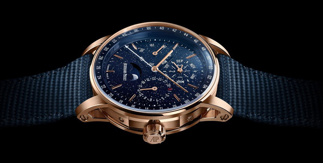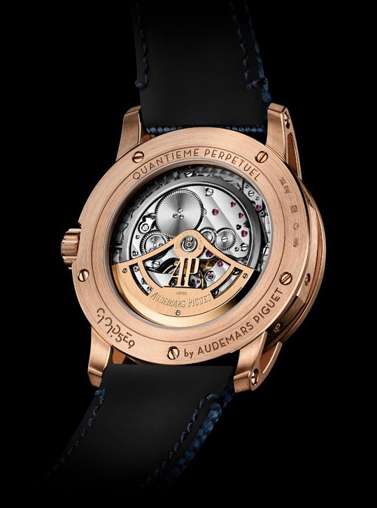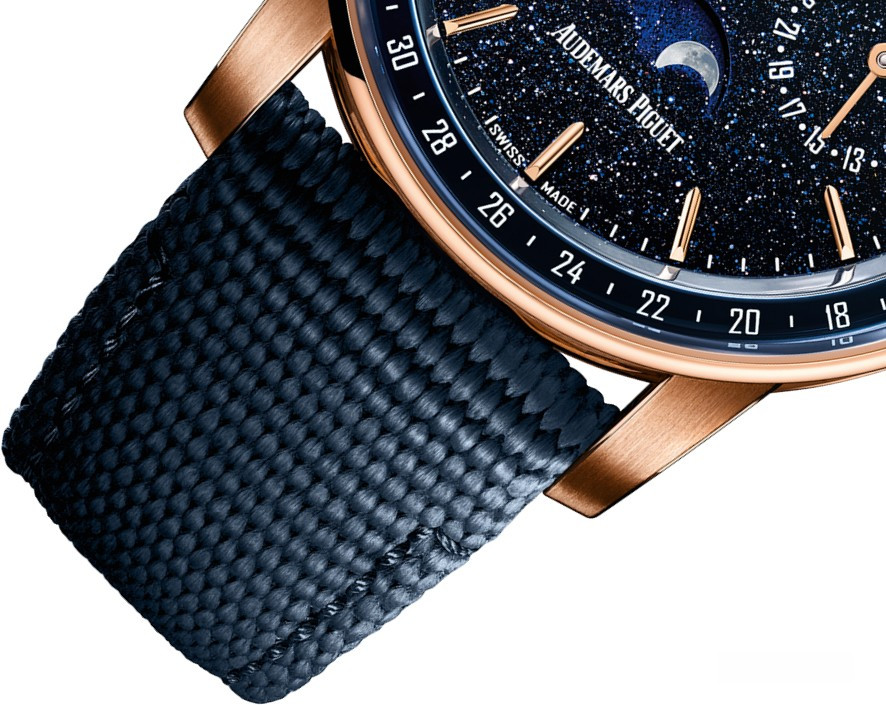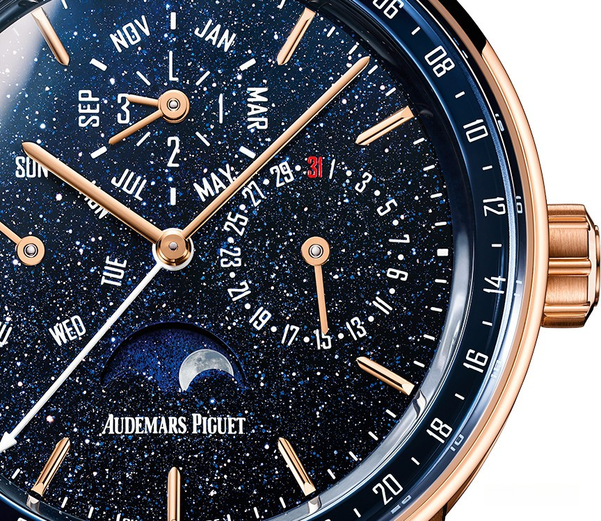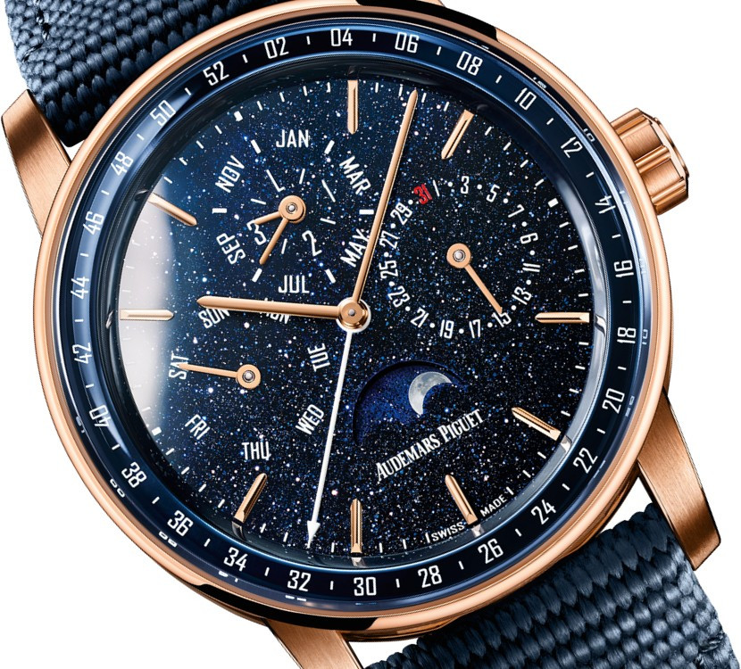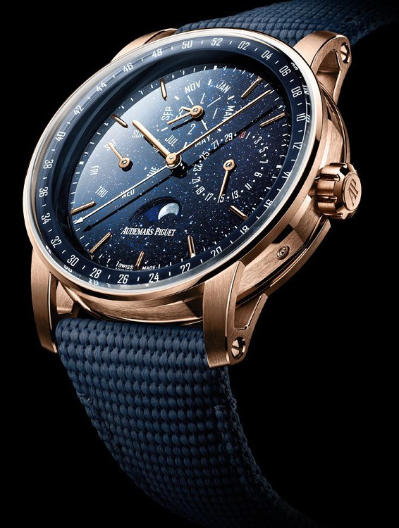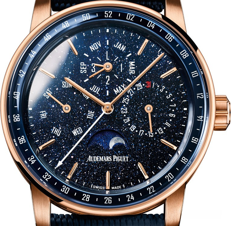 Часы Audemars Piguet Code 11.59 by Audemars Piguet Perperual Calendar 41 mm представлены в корпусе из розового золота 18к размером 41 х 11 мм и водонепроницаемостью 20 м. Внутри корпуса установлен механизм с ручным заводом, Калибр 5134, обладающий запасом хода 40 часов. На циферблате из синего авантюрина отображаются часы, минуты, секунды, дата, день недели, неделя, месяц, фаза луны, цикл високосного года. Часы комплектуются текстильным ремешком с золотой застежкой.