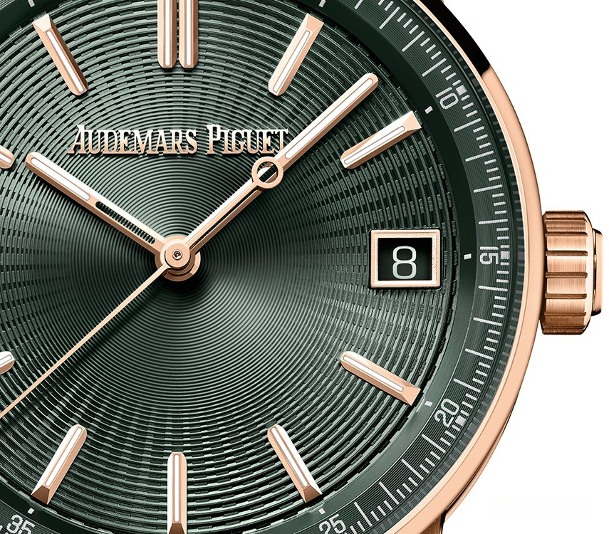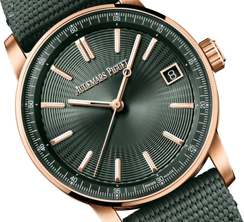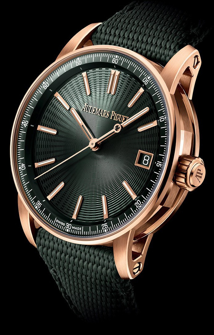Часы Audemars Piguet Code 11.59 by Audemars Piguet Selfwinding 41 mm представлены в корпусе из розового золота 18к размером 41 х 10.7 мм и водонепроницаемостью 30 м. Внутри корпуса установлен автоматический механизм, Калибр 4302, обладающий запасом хода 70 часов. На зеленом гилошированном циферблате отображаются часы, минуты, секунды, дата. Часы комплектуются текстильным ремешком с золотой застежкой.