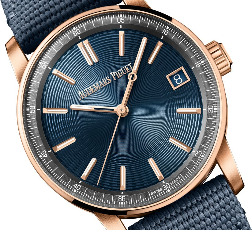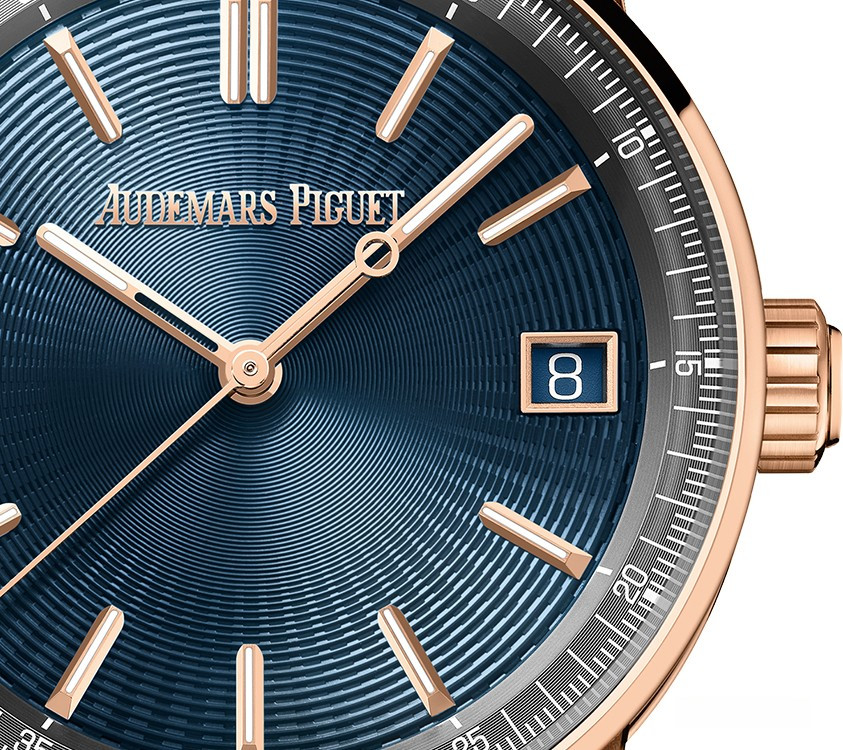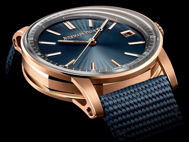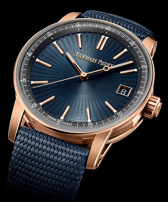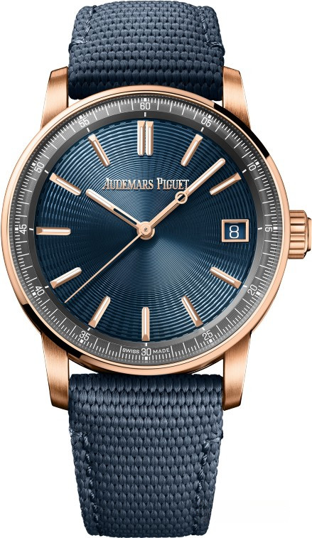 Часы Audemars Piguet Code 11.59 by Audemars Piguet Selfwinding 41 mm представлены в корпусе из розового золота 18к размером 41 х 10.7 мм и водонепроницаемостью 30 м. Внутри корпуса установлен автоматический механизм, Калибр 4302, обладающий запасом хода 70 часов. На синем гилошированном циферблате отображаются часы, минуты, секунды, дата. Часы комплектуются текстильным ремешком с золотой застежкой.
