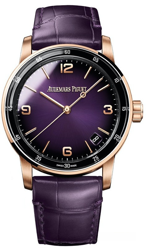 Часы Audemars Piguet Code 11.59 by Audemars Piguet Selfwinding 41 mm представлены в корпусе из розового золота 18к размером 41 х 10.7 мм и водонепроницаемостью 30 м. Внутри корпуса установлен автоматический механизм, Калибр 4302, обладающий запасом хода 70 часов. На фиолетовом циферблате отображаются часы, минуты, секунды и дата. Часы комплектуются ремешком из кожи аллигатора с вставкой из розового золота 18к.