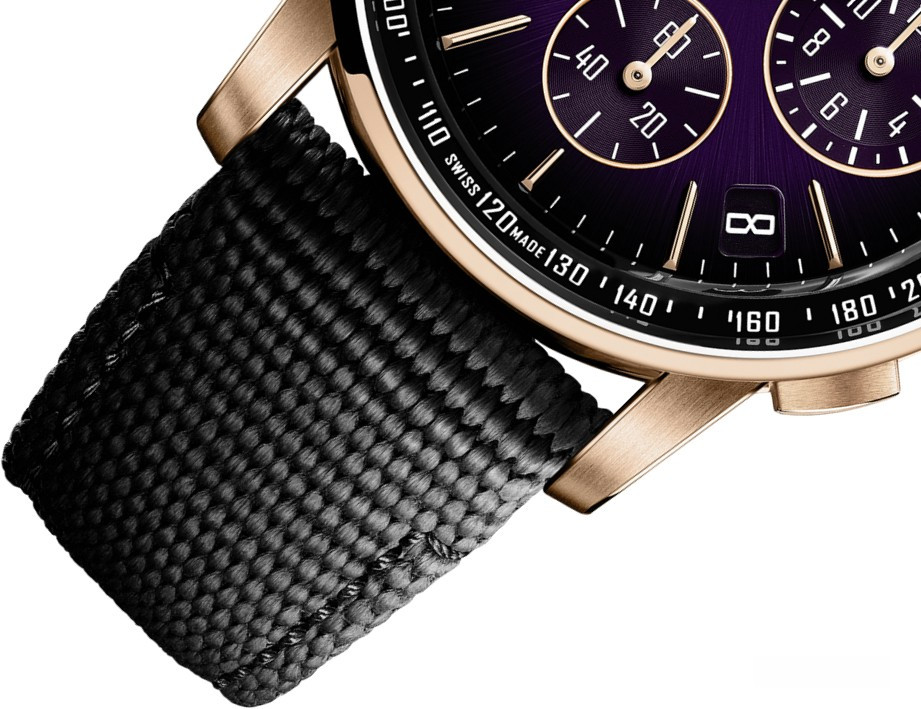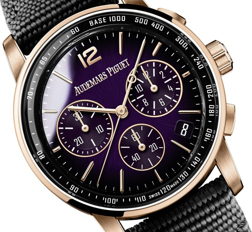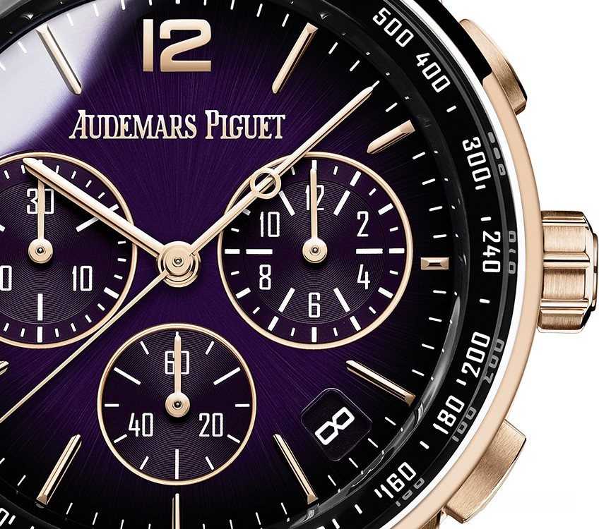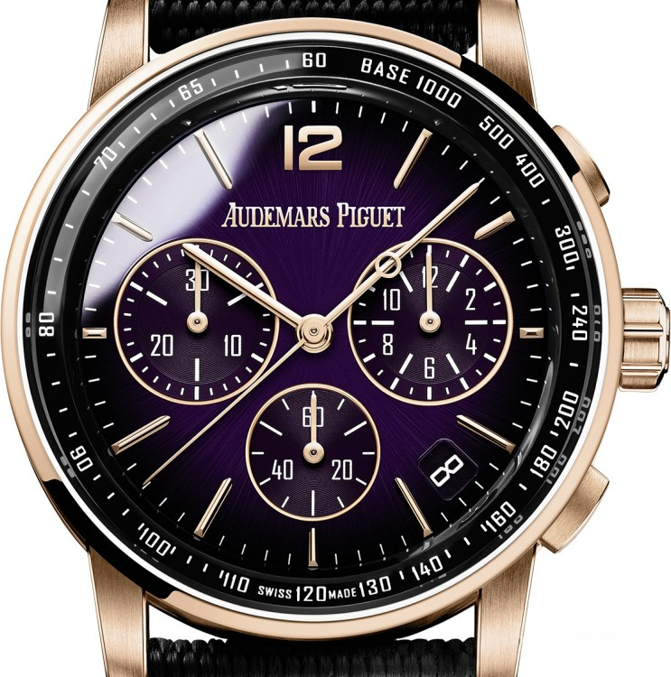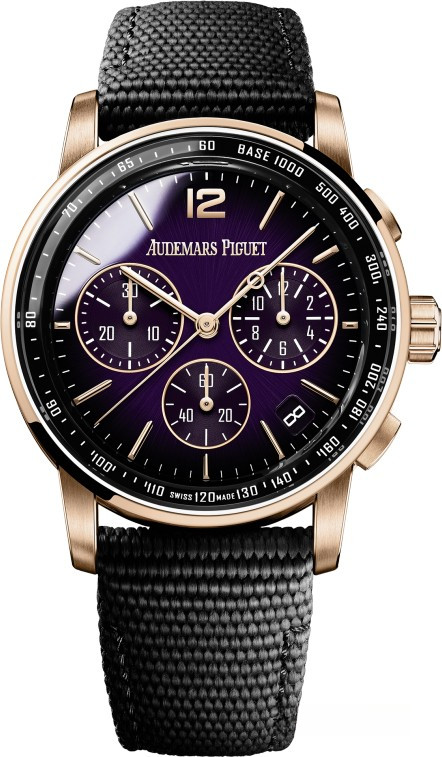 Часы Audemars Piguet Code 11.59 by Audemars Piguet Selfwinding Chronograph 41 mm представлены в корпусе из розового золота 18к размером 41 х 12.6 мм и водонепроницаемостью 30 м. Внутри корпуса установлен автоматический механизм, Калибр 4401, обладающий запасом хода 70 часов. На фиолетовом циферблате отображаются часы, минуты, секунды, дата, тахиметр. Часы комплектуются текстильным ремешком с золотой застежкой.