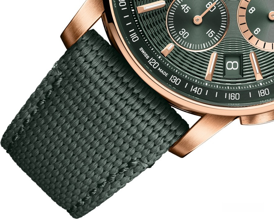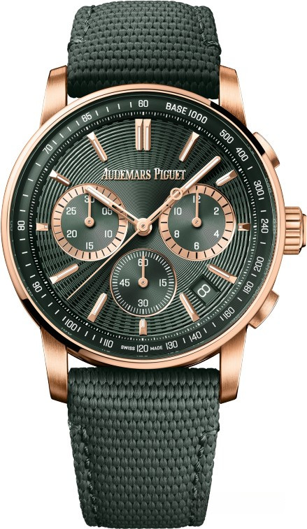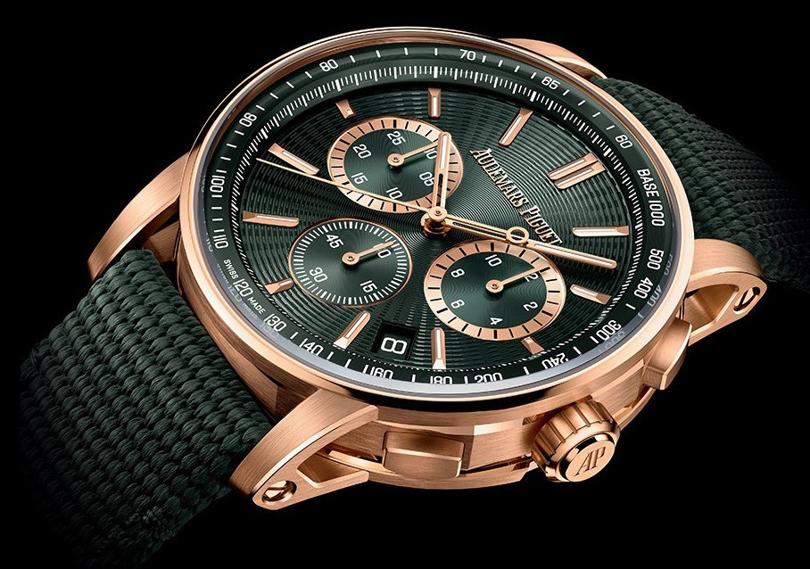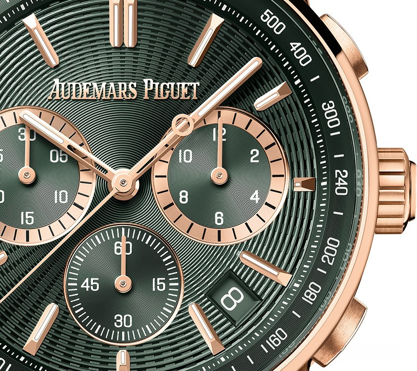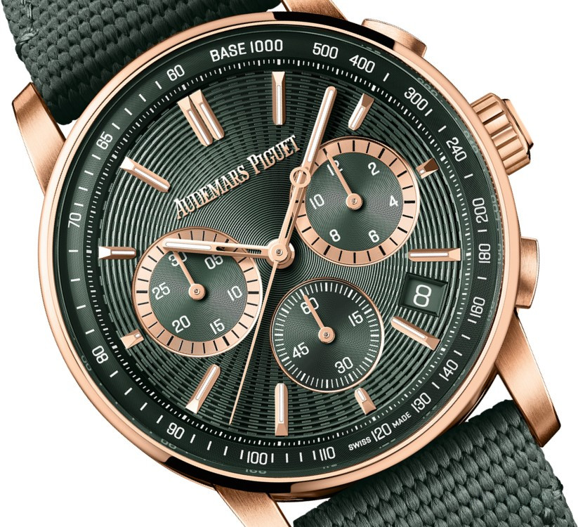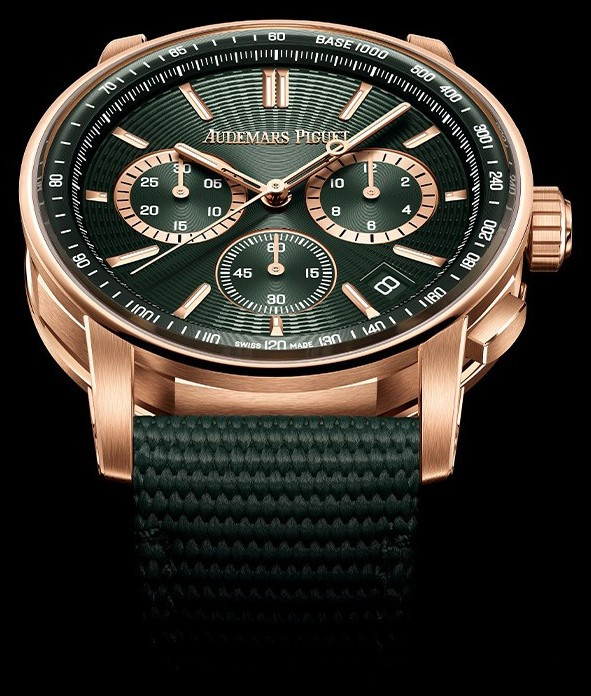 Часы Audemars Piguet Code 11.59 by Audemars Piguet Selfwinding Chronograph 41 mm представлены в корпусе из розового золота 18к размером 41 х 12.6 мм и водонепроницаемостью 30 м. Внутри корпуса установлен автоматический механизм, Калибр 4401, обладающий запасом хода 70 часов. На зеленом циферблате отображаются часы, минуты, секунды, дата, тахиметр. Часы комплектуются текстильным ремешком с золотой застежкой.