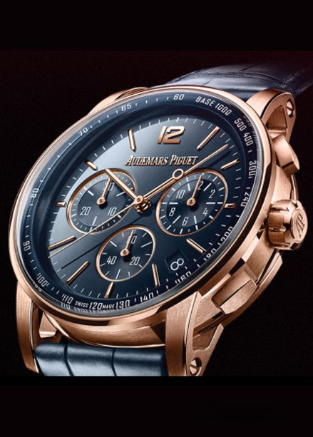Часы Audemars Piguet Code 11.59 by Audemars Piguet Selfwinding Chronograph 41 mm представлены в корпусе из розового золота 18к размером 41 х 12.6 мм и водонепроницаемостью 30 м. Внутри корпуса установлен автоматический механизм, Калибр 4401, обладающий запасом хода 70 часов. На синем циферблате отображаются часы, минуты, секунды, дата, тахиметр. Часы комплектуются ремешком из кожи аллигатора с вставкой из розового золота 18к.