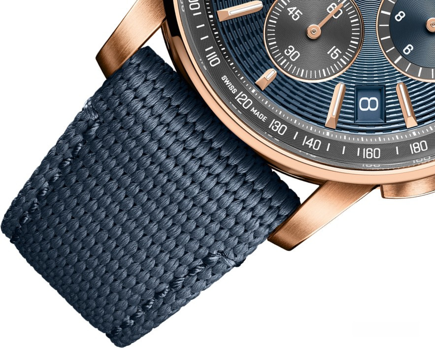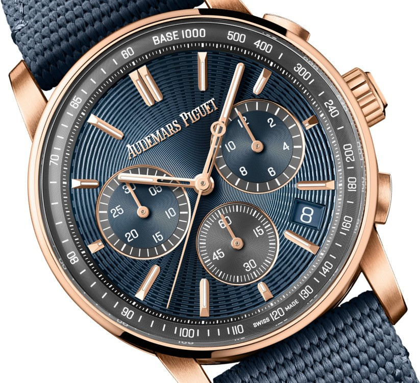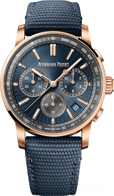 Часы Audemars Piguet Code 11.59 by Audemars Piguet Selfwinding Chronograph 41 mm представлены в корпусе из розового золота 18к размером 41 х 12.6 мм и водонепроницаемостью 30 м. Внутри корпуса установлен автоматический механизм, Калибр 4401, обладающий запасом хода 70 часов. На синем циферблате отображаются часы, минуты, секунды, дата, тахиметр. Часы комплектуются текстильным ремешком с золотой застежкой.