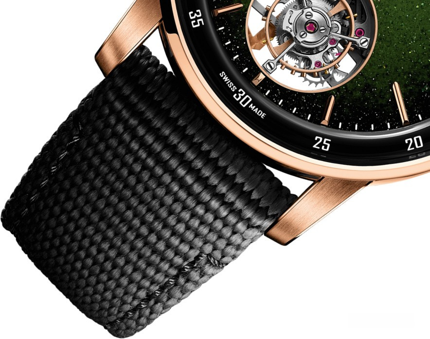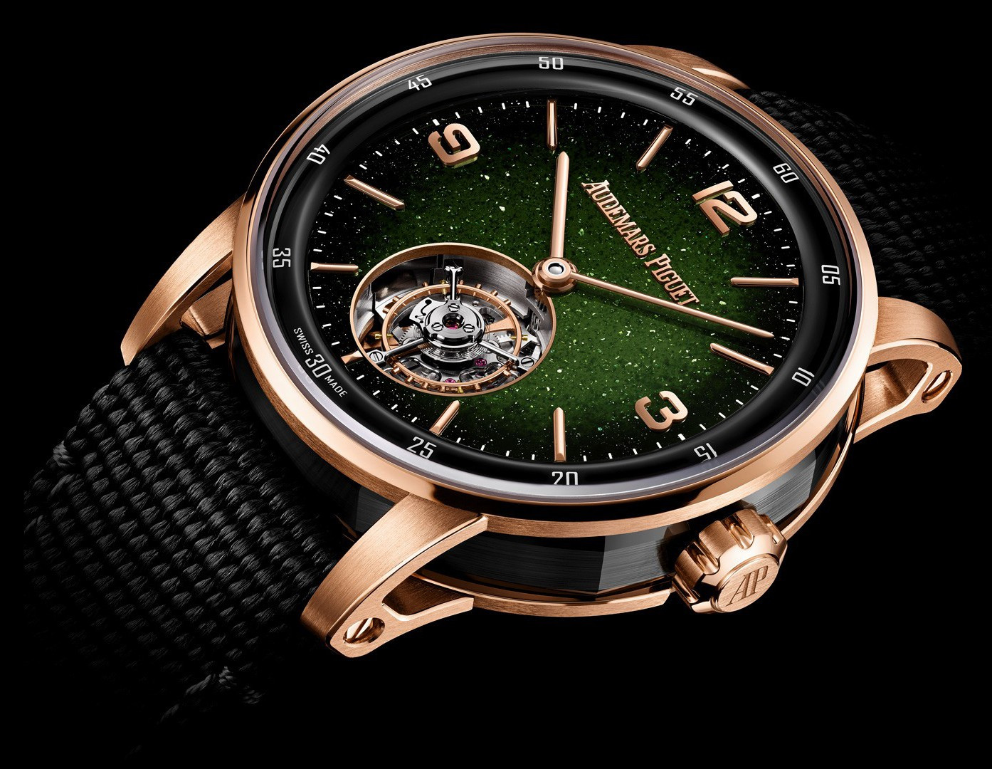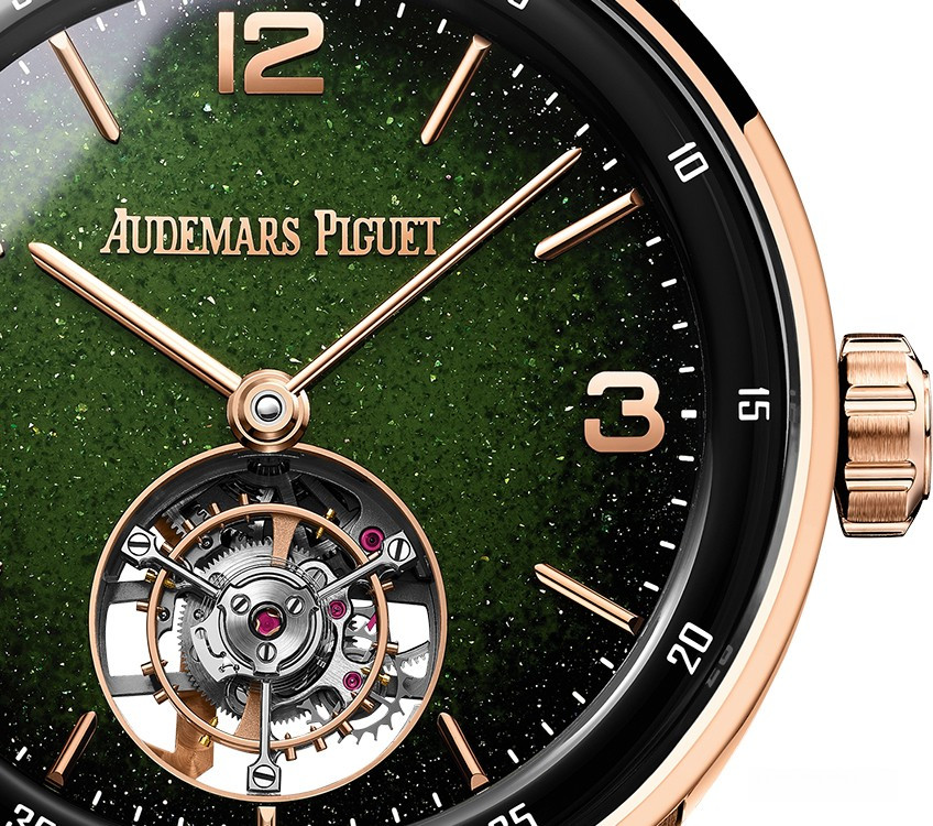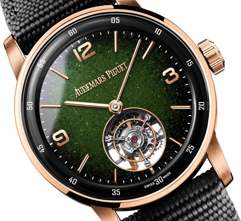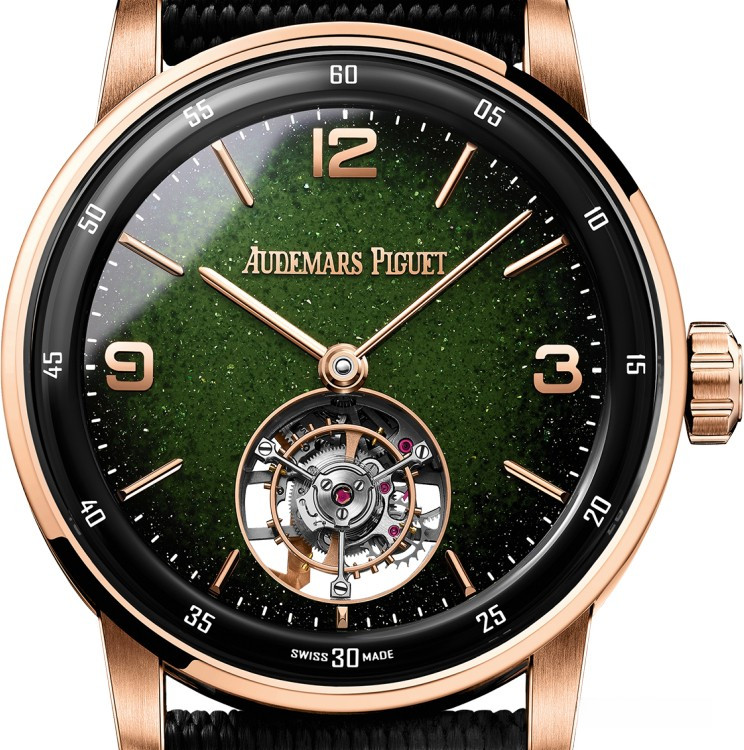 Часы Audemars Piguet Selfwinding Flying Tourbillon 41 mm представлены в корпусе из розового золота 18к и керамики размером 41 х 11.8 мм и водонепроницаемостью 30 м. Внутри корпуса установлен автоматический механизм, Калибр 2950, обладающий запасом хода 65 часов. На зеленом циферблате отображаются часы, минуты, клеть турбийона расположена на 6-ти часах. Часы комплектуются текстильным ремешком с золотой застежкой.