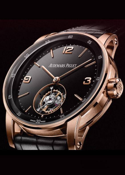 Часы Audemars Piguet Selfwinding Flying Tourbillon 41 mm представлены в корпусе из розового золота 18к размером 41 х 11.8 мм и водонепроницаемостью 30 м. Внутри корпуса установлен автоматический механизм, Калибр 2950, обладающий запасом хода 65 часов. На черном циферблате отображаются часы, минуты, клеть турбийона расположена на 6-ти часах. Часы комплектуются ремешком из кожи аллигатора с вставкой из розового золота 18к.