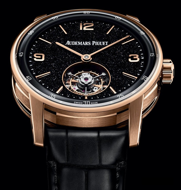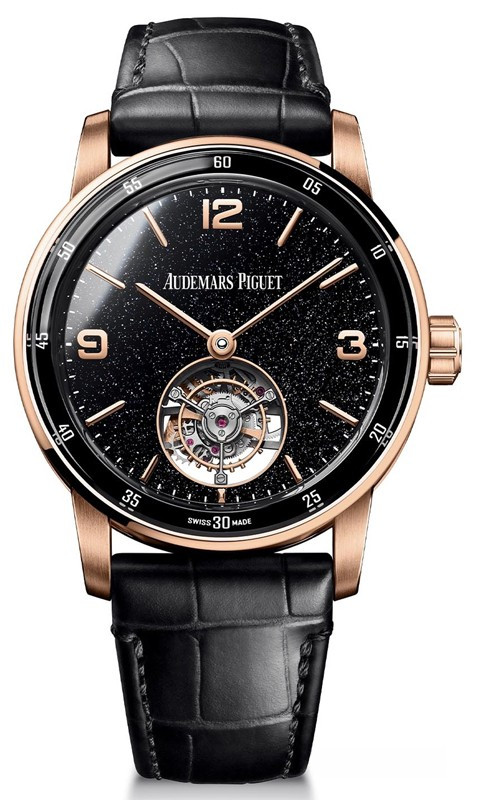 Часы Audemars Piguet Selfwinding Flying Tourbillon 41 mm представлены в корпусе из розового золота 18к размером 41 х 11.8 мм и водонепроницаемостью 30 м. Внутри корпуса установлен автоматический механизм, Калибр 2950, обладающий запасом хода 65 часов. На черном авантюриновом циферблате отображаются часы, минуты, клеть турбийона расположена на 6-ти часах. Часы комплектуются ремешком из кожи аллигатора с вставкой из розового золота 18к.