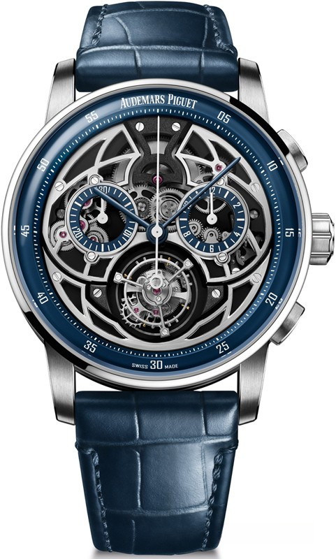 Часы Audemars Piguet Code 11.59 Selfwinding Flying Tourbillon Chronograph представлены в корпусе из белого золота 18к размером 41 мм водонепроницаемостью 30 метров. Внутри корпуса установлен автоматический механизм, Калибр 2952, обладающий запасом хода 65 часов. На синем скелетированном циферблате отображаются часы, минуты, секунды, накопители хронографа, клеть турбийона. Часы поставляются на ремешке из кожи аллигатора с вставкой из белого золота 18к. Серия ограничена - 50 шт.