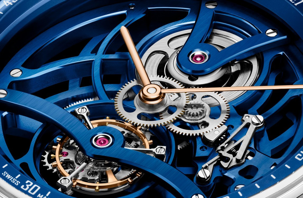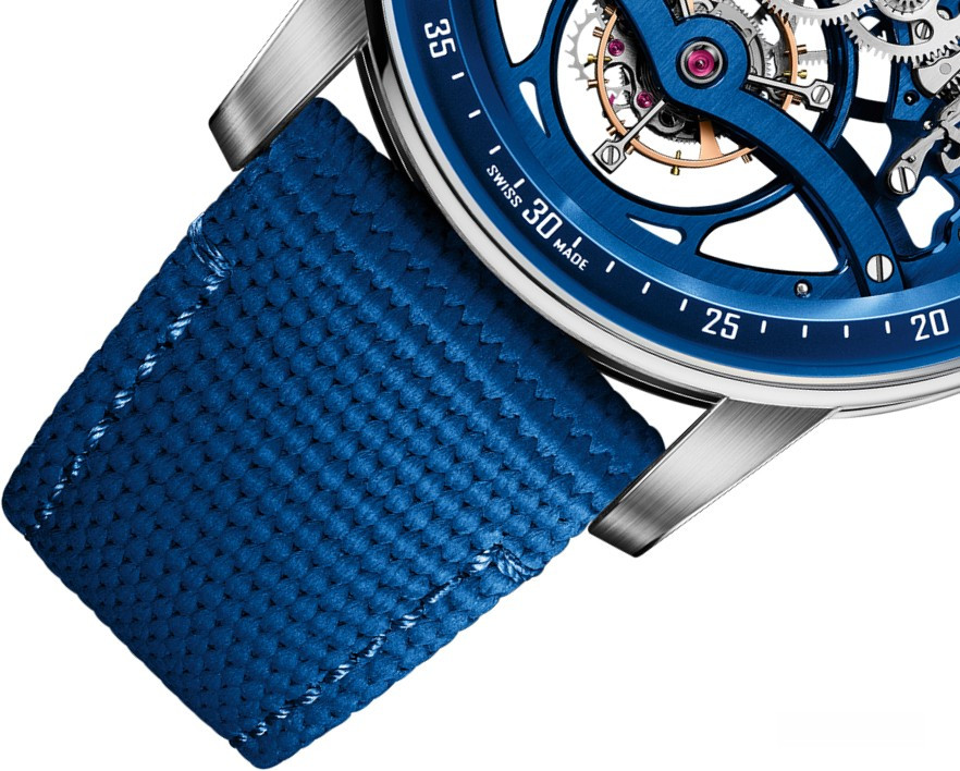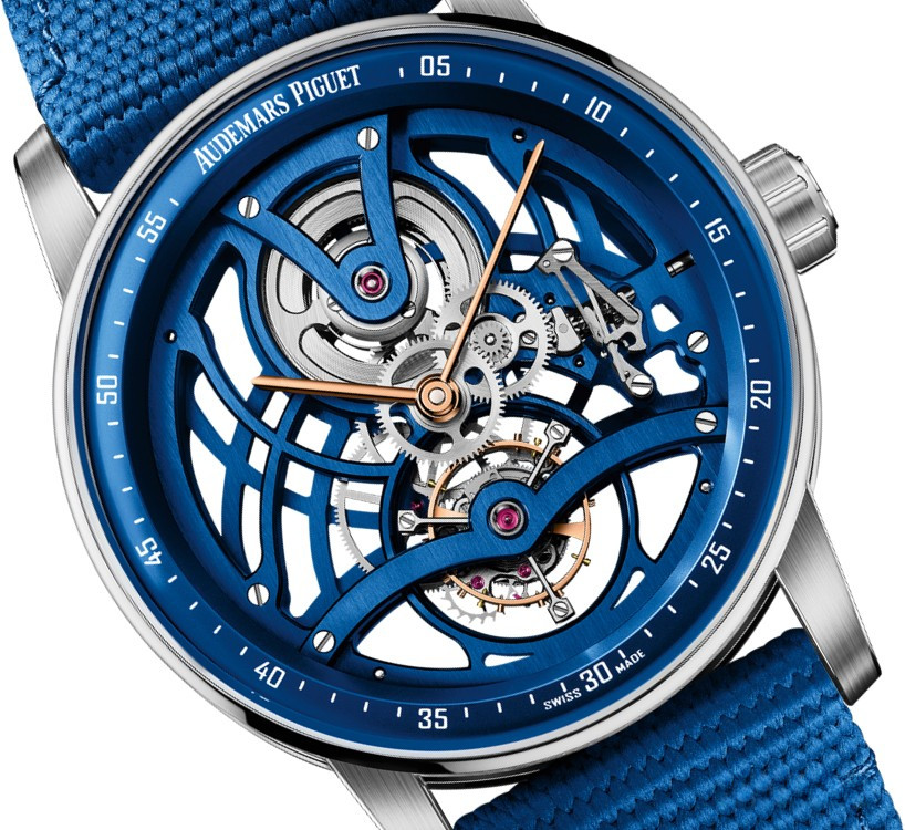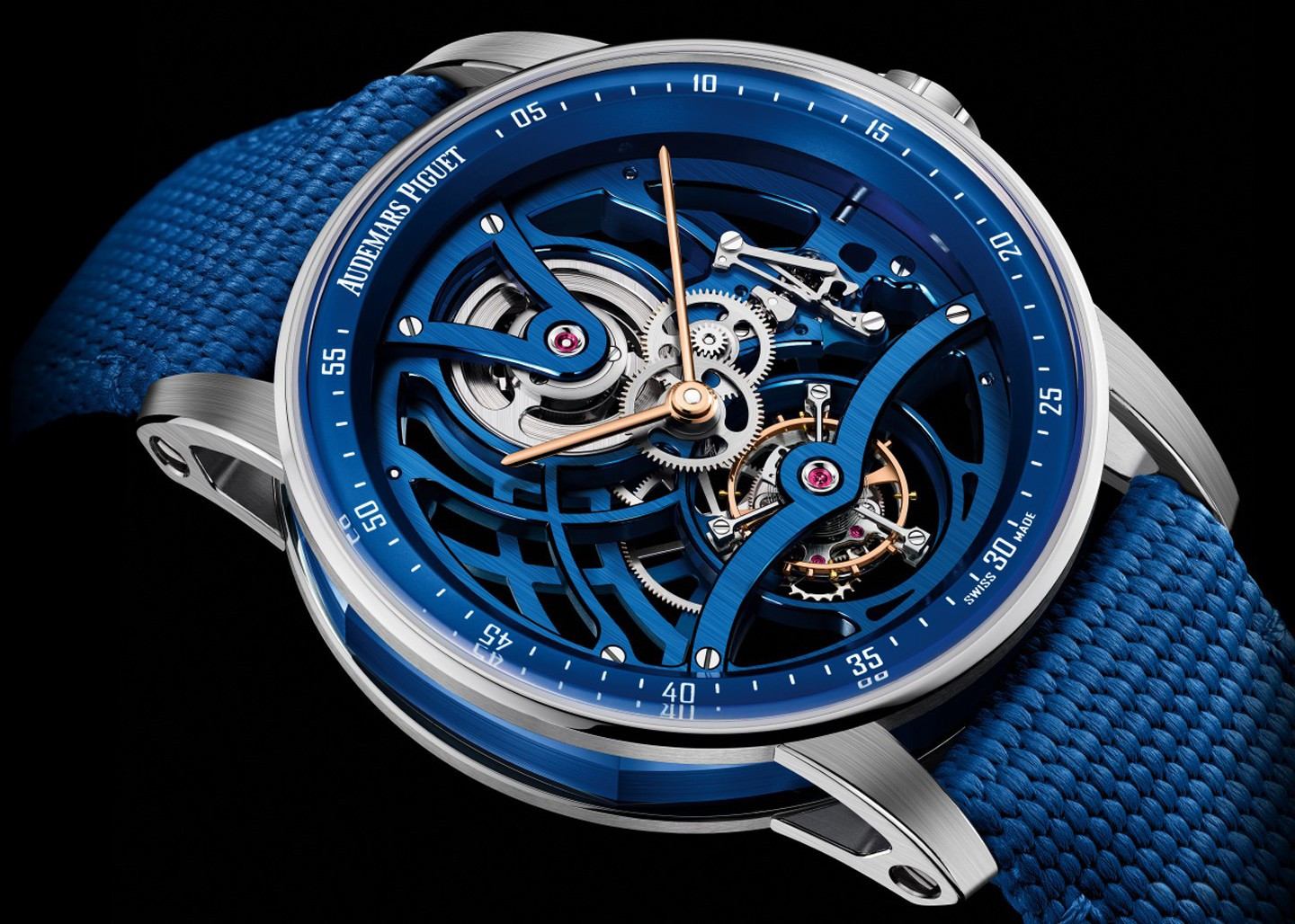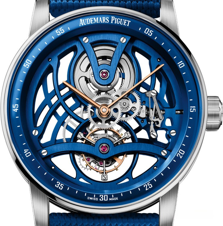Часы Audemars Piguet Code 11.59 by Audemars Piguet Tourbillon Openworked 41 mm представлены в корпусе из белого золота 18к и керамики размером 41 х 10.7 мм и водонепроницаемостью 30 м. Внутри корпуса установлен механизм с ручным заводом, Калибр 2948, обладающий запасом хода 72 часа. На голубом циферблате отображаются часы, минуты и клеть турбийона. Часы комплектуются текстильным ремешком с золотой застежкой. Серия ограничена - 50 шт.