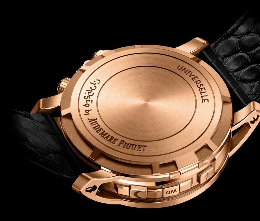 Часы Audemars Piguet Code 11.59 Ultra Complication Universelle представлены в корпусе из розового золота 18к размером 42 х 15.6 мм водонепроницаемостью 20 метров. Внутри корпуса находится автоматический мехнизм, Калибр 1000, обладающий запасом хода 64 часа. На черном циферблате отображаются часы, минуты, секунды, дата, месяц, фаза луны, тахиметр, репетир. Часы поставляются с ремешком из кожи аллигатора с золотой застежкой.