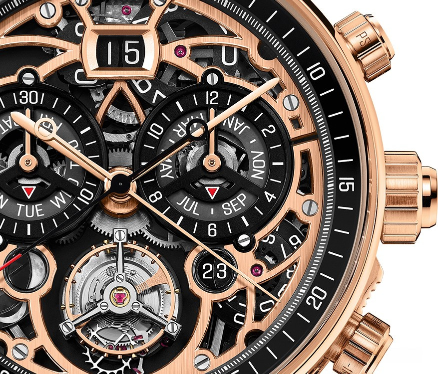 Часы Audemars Piguet Code 11.59 Ultra Complication Universelle представлены в корпусе из розового золота 18к размером 42 х 15.6 мм водонепроницаемостью 20 метров. Внутри корпуса находится автоматический мехнизм, Калибр 1000, обладающий запасом хода 64 часа. На черном циферблате отображаются часы, минуты, секунды, дата, месяц, фаза луны, тахиметр, репетир. Часы поставляются с ремешком из кожи аллигатора с золотой застежкой.
