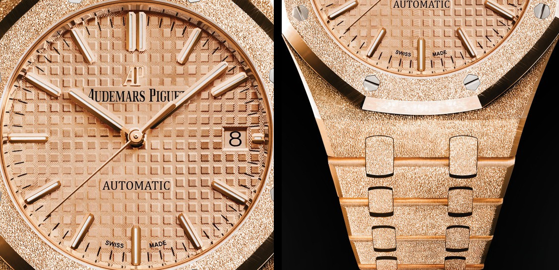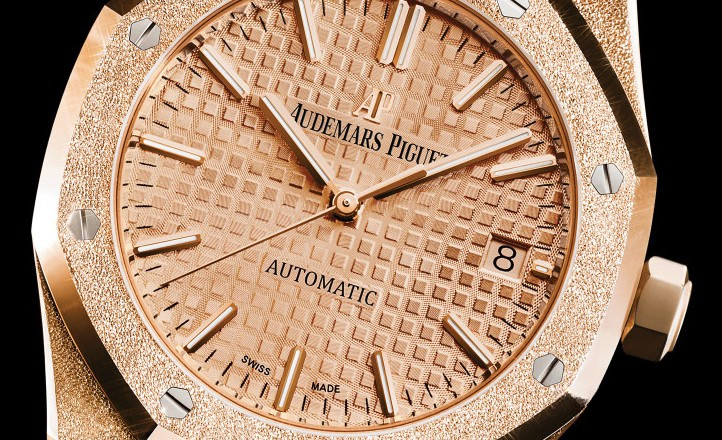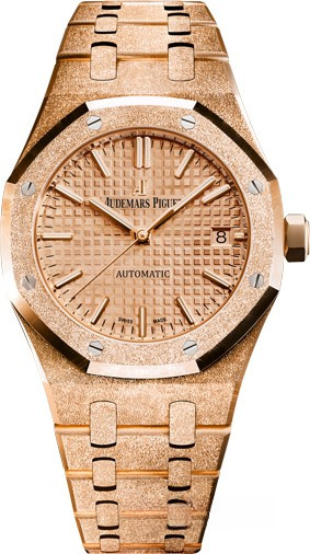 Часы Audemars Piguet Royal Oak Frosted Gold 37mm представлены в корпусе размером 37 х 9.8 мм из розового золота 18к, сапфировое стекло с обеих сторон, водонепроницаемость 50 метров. Внутри корпуса установлен автоматический механизм, Калибр 3120, с запасом хода 60 часов; функции – часы, минуты, секунды, дата. Браслет интегрированный, из 18-каратного золота.