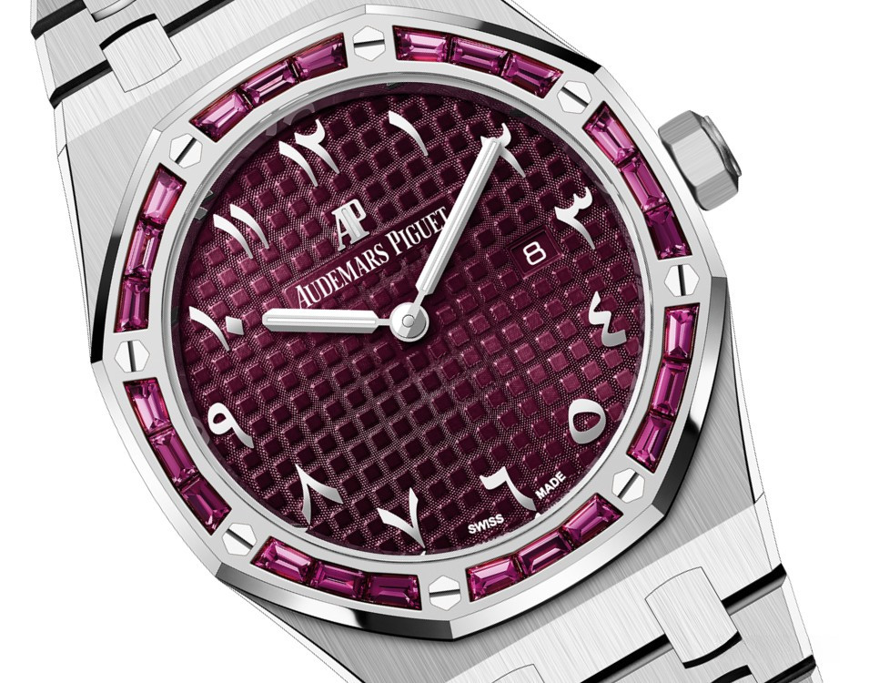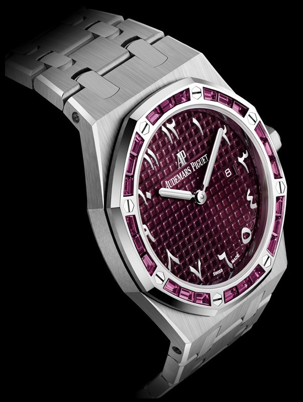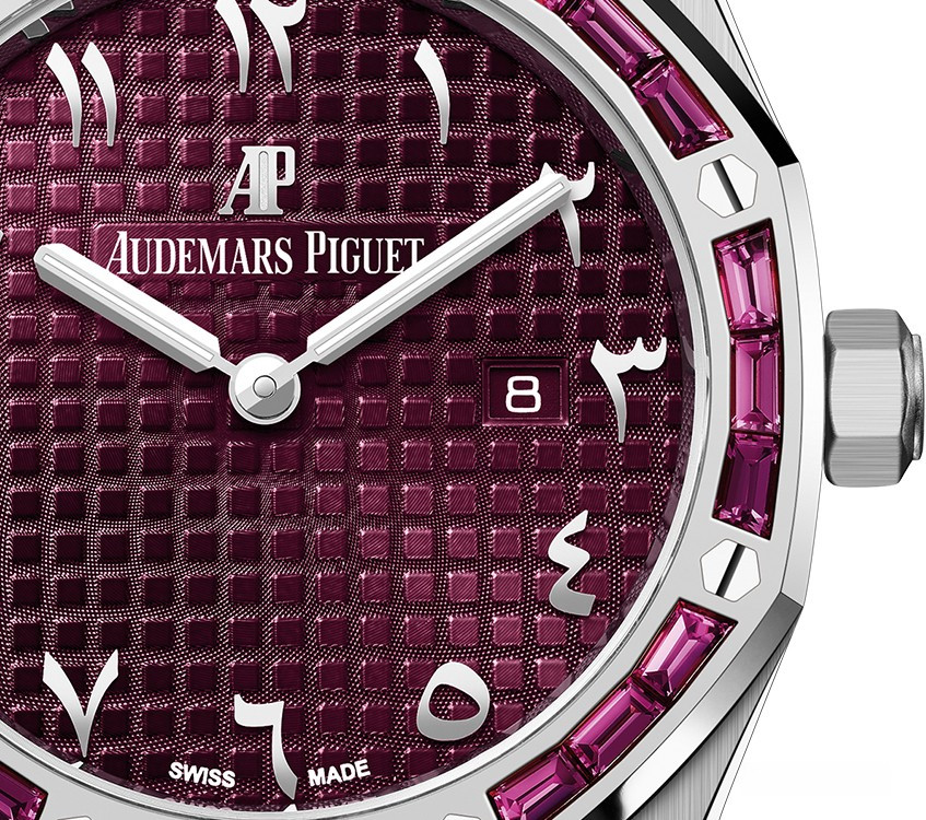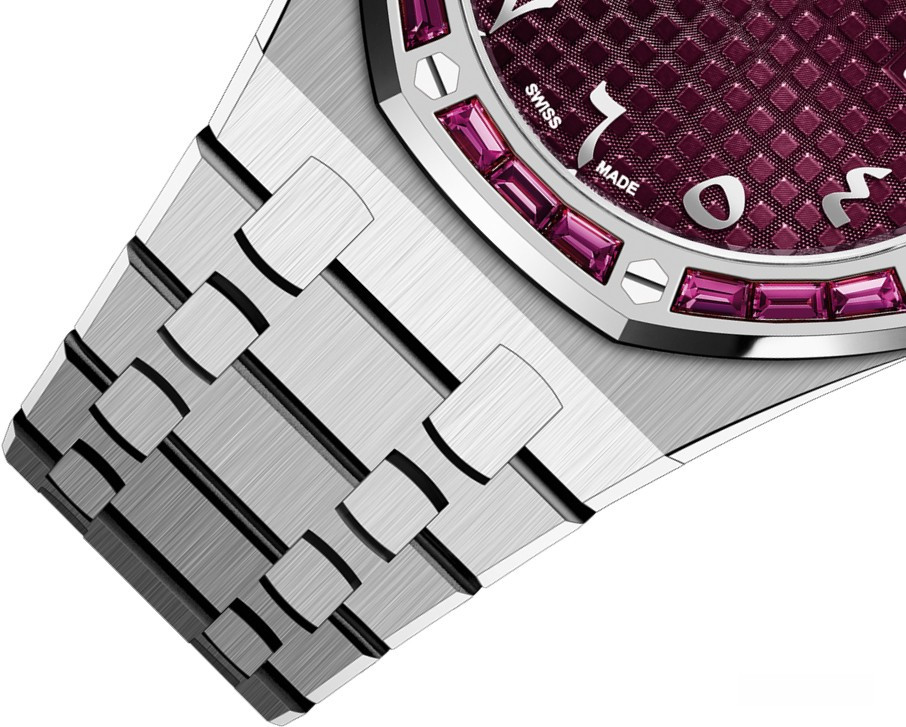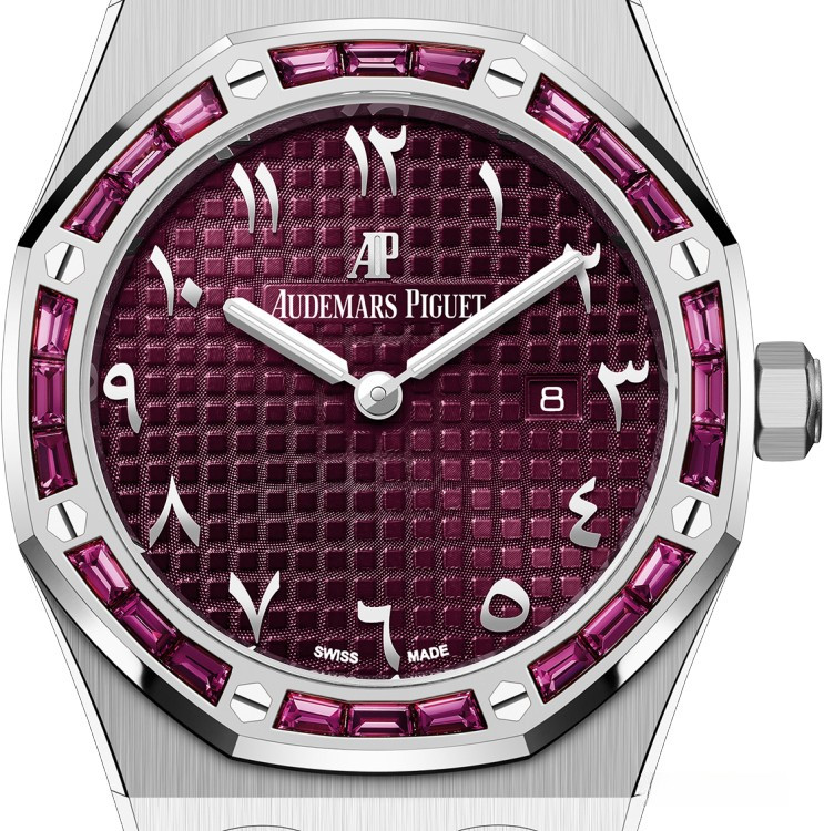 Часы Audemars Piguet Royal Oak Quartz выпущены в корпусе из белого золота 18к размером 33 х 7 мм с водонепроницаемостью 20 м. Внутри корпуса установлен кварцевый механизм, Калибр АР 2713. На бордовом циферблате отображаются часы, минуты, дата. Часы комплектуются браслетом из белого золота 18к. Безель из гранатов.