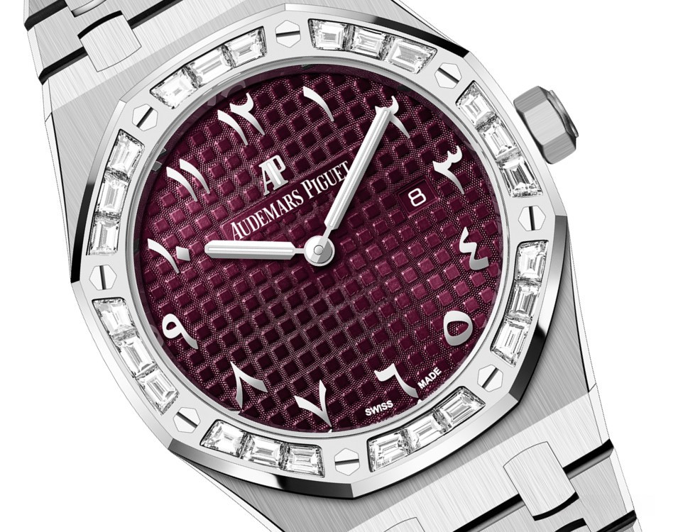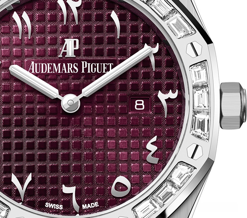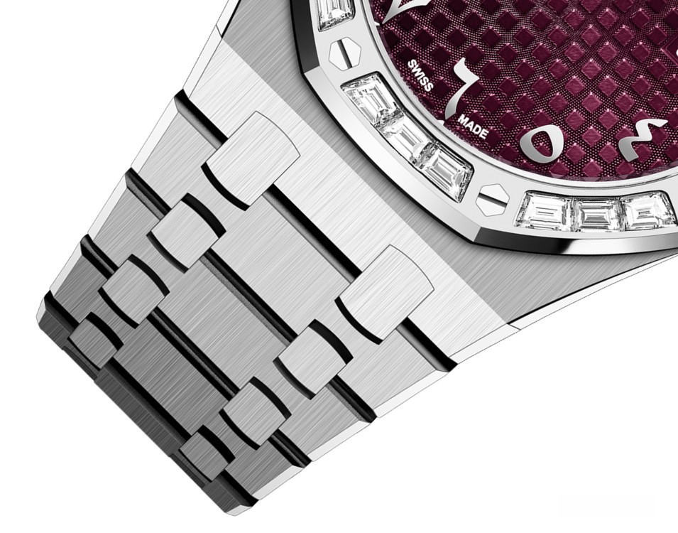 Часы Audemars Piguet Royal Oak Quartz выпущены в корпусе из белого золота 18к размером 33 х 7 мм с водонепроницаемостью 20 м. Внутри корпуса установлен кварцевый механизм, Калибр АР 2713. На бордовом циферблате отображаются часы, минуты, дата. Часы комплектуются браслетом из белого золота 18к. Безель из белых багетных бриллиантов.