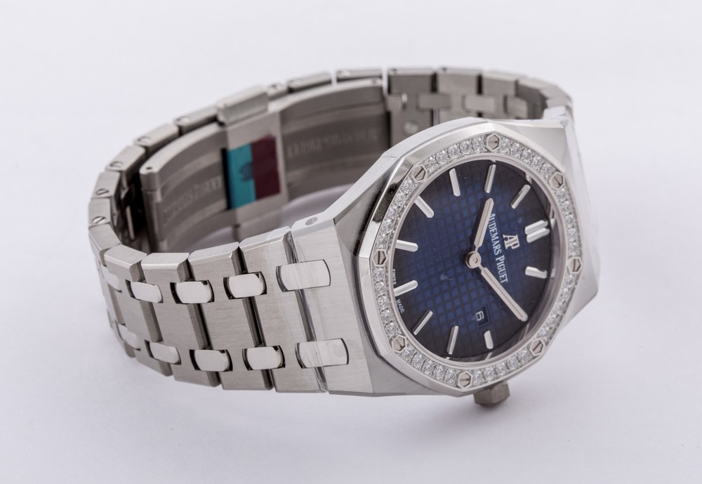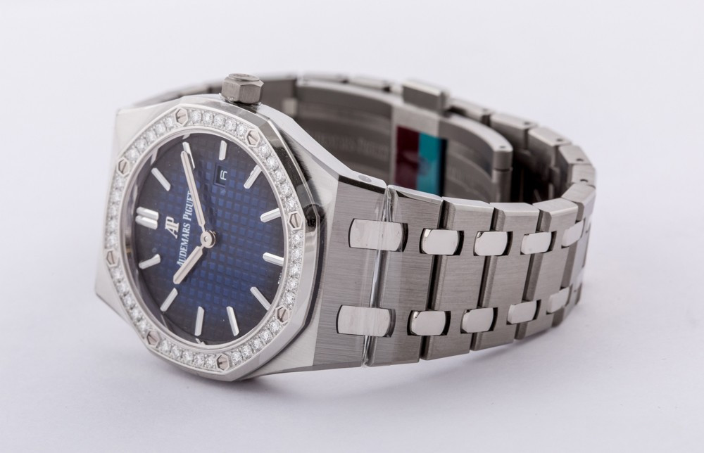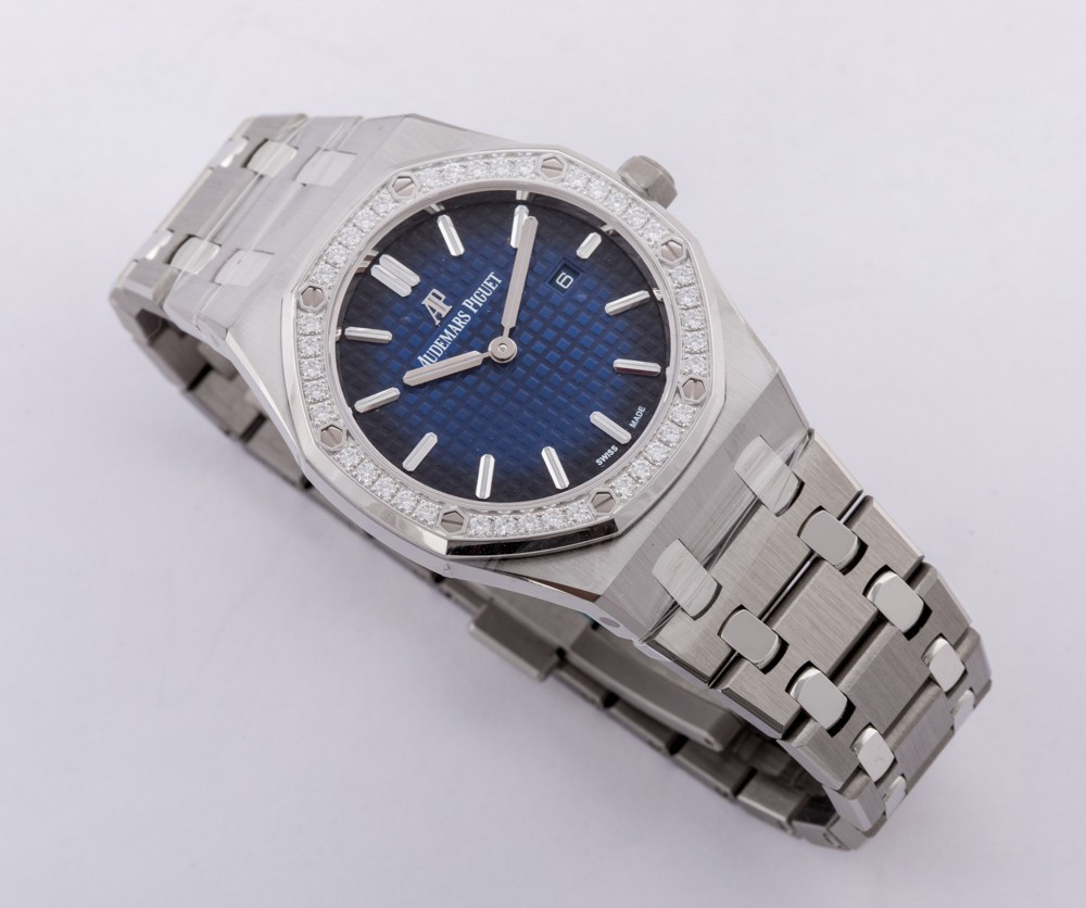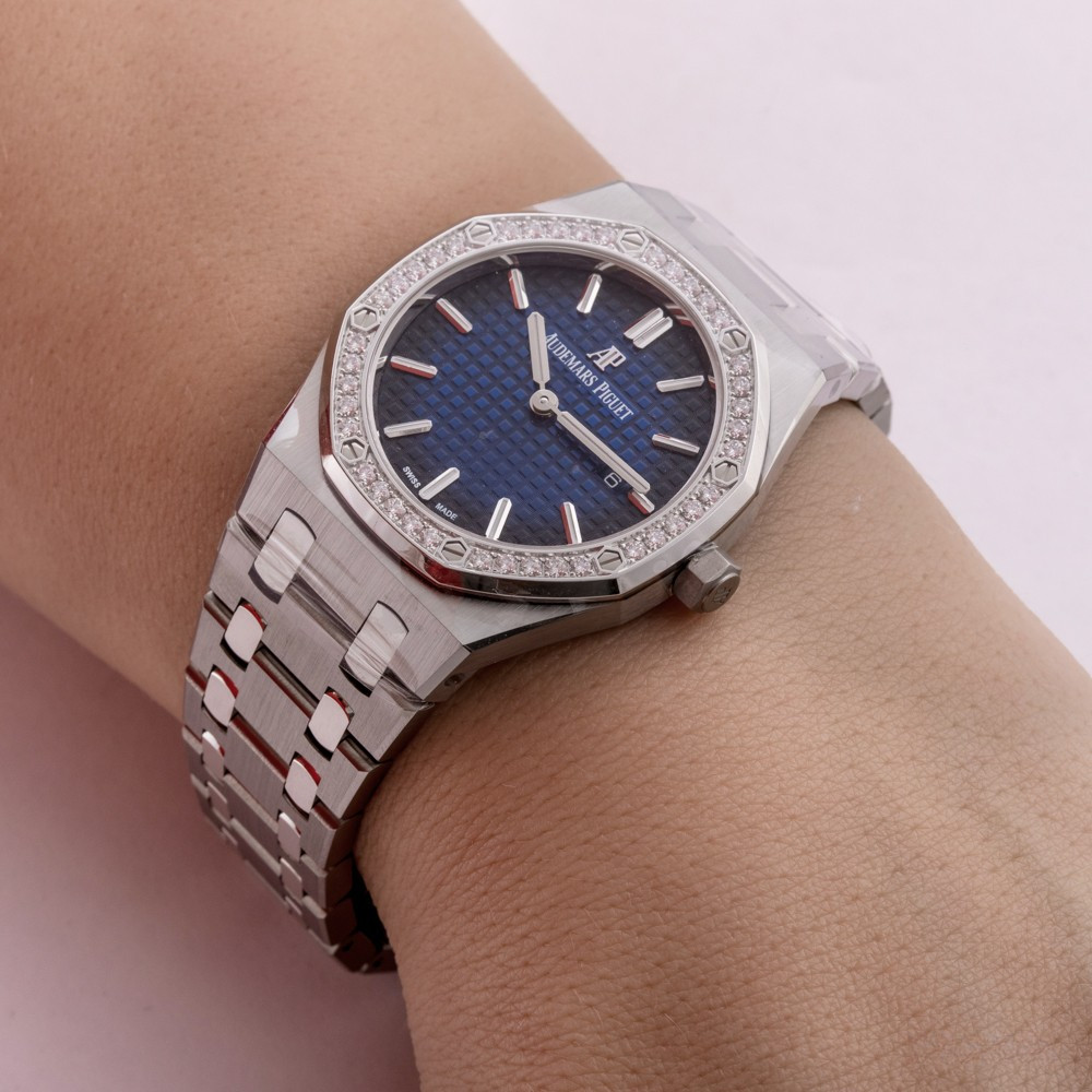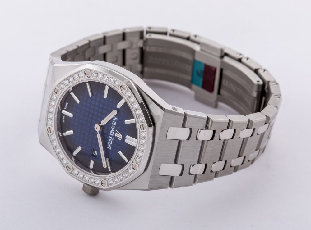 Часы Audemars Piguet Royal Oak Quartz 67651IP.ZZ.1261IP.01 выпущены в корпусе из титана и платины, размером 33 х 7 мм с водонепроницаемостью 50 м. Внутри корпуса установлен кварцевый механизм, Калибр АР 2713. На синем гильошированном циферблате отображаются часы, минуты, дата. Часы комплектуются браслетом из титана и платины. Безель из 40-ка белых бриллиантов общим весом 0.73 ct.