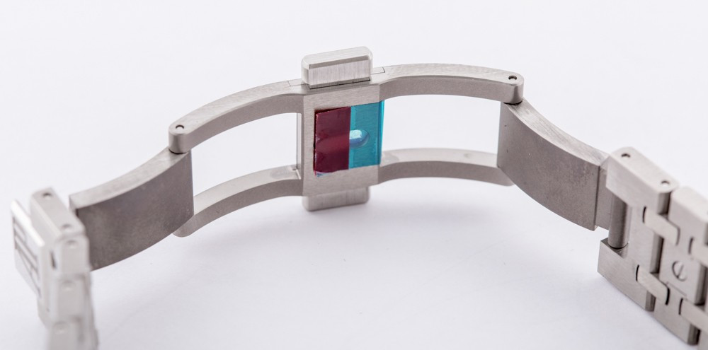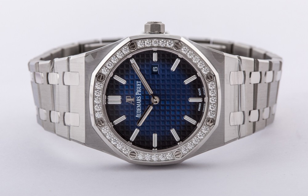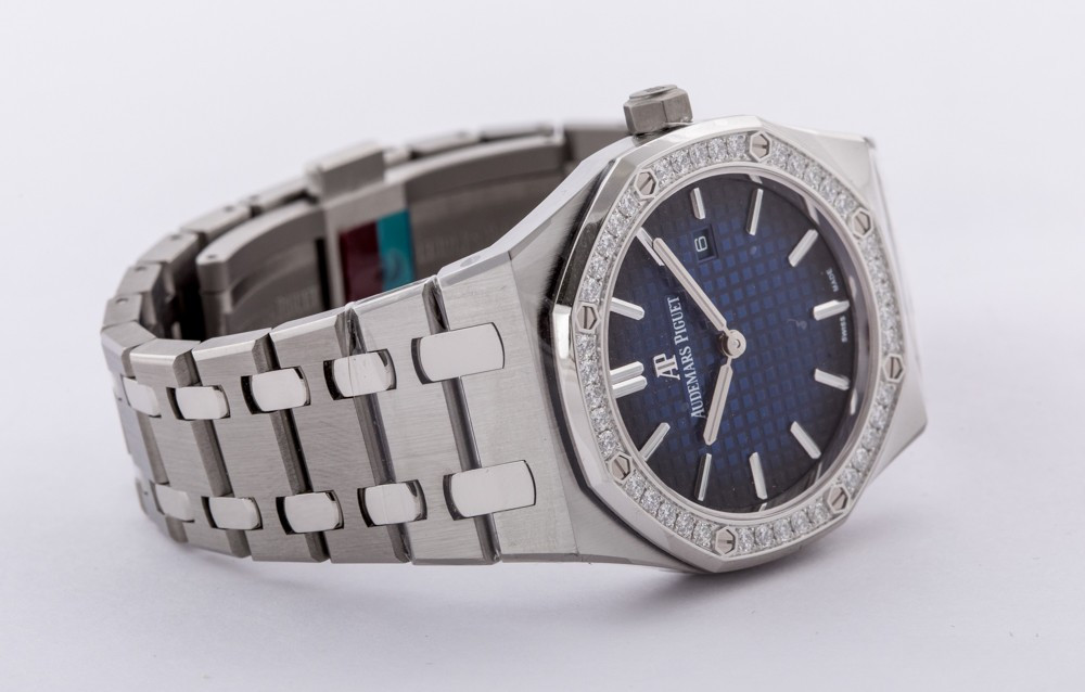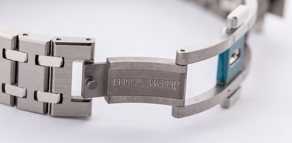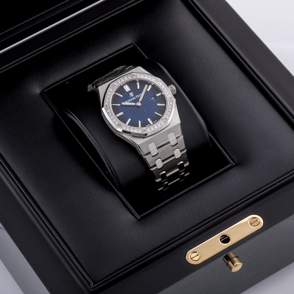 Часы Audemars Piguet Royal Oak Quartz 67651IP.ZZ.1261IP.01 выпущены в корпусе из титана и платины, размером 33 х 7 мм с водонепроницаемостью 50 м. Внутри корпуса установлен кварцевый механизм, Калибр АР 2713. На синем гильошированном циферблате отображаются часы, минуты, дата. Часы комплектуются браслетом из титана и платины. Безель из 40-ка белых бриллиантов общим весом 0.73 ct.