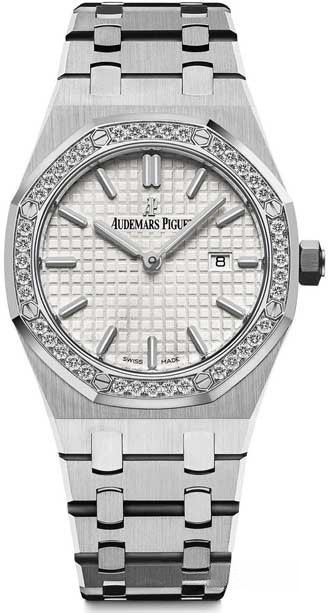 Часы Audemars Piguet Royal Oak Quartz Steel 67651ST.ZZ.1261ST.01 выпущены в корпусе из нержавеющей стали, размером 33 х 7 мм с водонепроницаемостью 50 м с безелем из 40 белых бриллиантов. Внутри корпуса установлен кварцевый механизм, Калибр АР 2385. На белом гильошированном циферблате отображаются часы, минуты, дата. Часы комплектуются браслетом из нержавеющей стали.