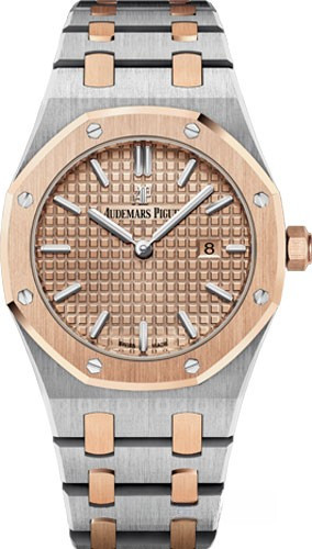 Часы Audemars Piguet Royal Oak Quartz Steel and Gold выпущены в корпусе из нержавеющей стали и розового золота 18к, размером 33 х 7 мм с водонепроницаемостью 50 м. Внутри корпуса установлен кварцевый механизм, Калибр АР 2713. На золотистом гильошированном Grande Tapisserie циферблате отображаются часы, минуты и дата. Часы комплектуются браслетом из нержавеющей стали и розового золота 18к.
