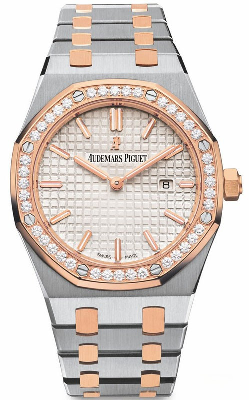 Часы Audemars Piguet Royal Oak Quartz Steel and Gold выпущены в корпусе из нержавеющей стали и розового золота 18к, размером 33 х 7 мм с водонепроницаемостью 50 м. Внутри корпуса установлен кварцевый механизм, Калибр АР 2713. На серебристом гильошированном Grande Tapisserie циферблате отображаются часы, минуты и дата. Часы комплектуются браслетом из нержавеющей стали и розового золота 18к. Безель из 40 белых бриллиантов общим весом 0.73 ct.