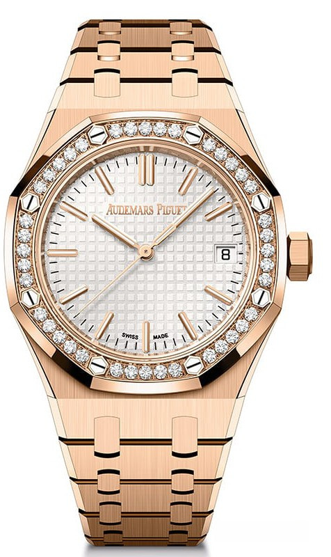 Часы Audemars Piguet Royal Oak Selfwinding 37 mm 2022 представлены в корпусе размером 37 х 8.9 мм из розового золота 18к водонепроницаемостью 50 метров. Внутри корпуса установлен автоматический механизм, Калибр AP 5900, обладающий запасом хода 60 часов. На серебристом гильошированном циферблате отображаются часы, минуты, секунды, дата. Часы поставляются на браслете из розового золота 18к. Безель из белых бриллиантов.