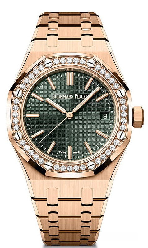 Часы Audemars Piguet Royal Oak Selfwinding 37 mm 2022 представлены в корпусе размером 37 х 8.9 мм из розового золота 18к водонепроницаемостью 50 метров. Внутри корпуса установлен автоматический механизм, Калибр AP 5900, обладающий запасом хода 60 часов. На зеленом гильошированном циферблате отображаются часы, минуты, секунды, дата. Часы поставляются на браслете из розового золота 18к. Безель из белых бриллиантов.